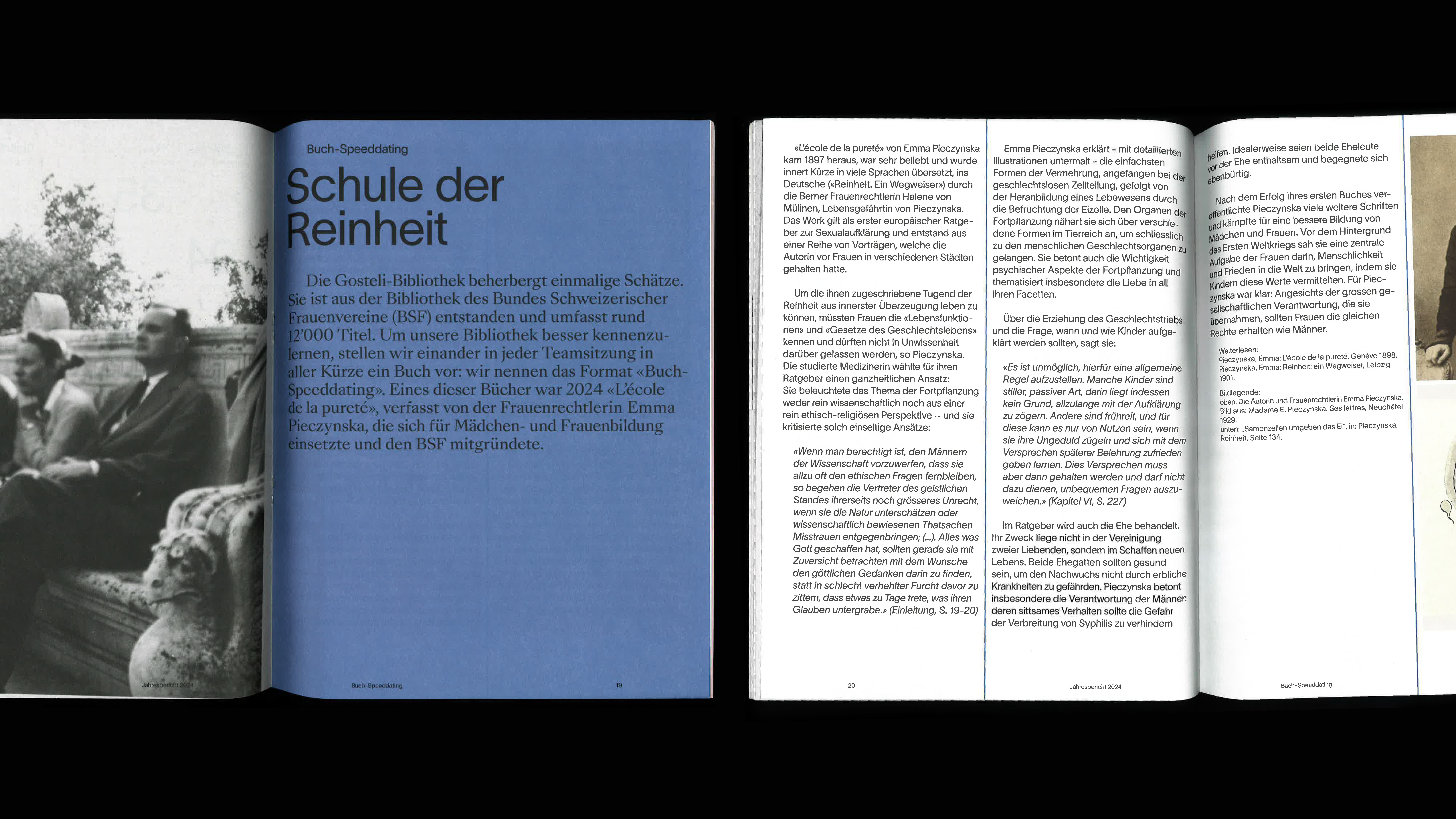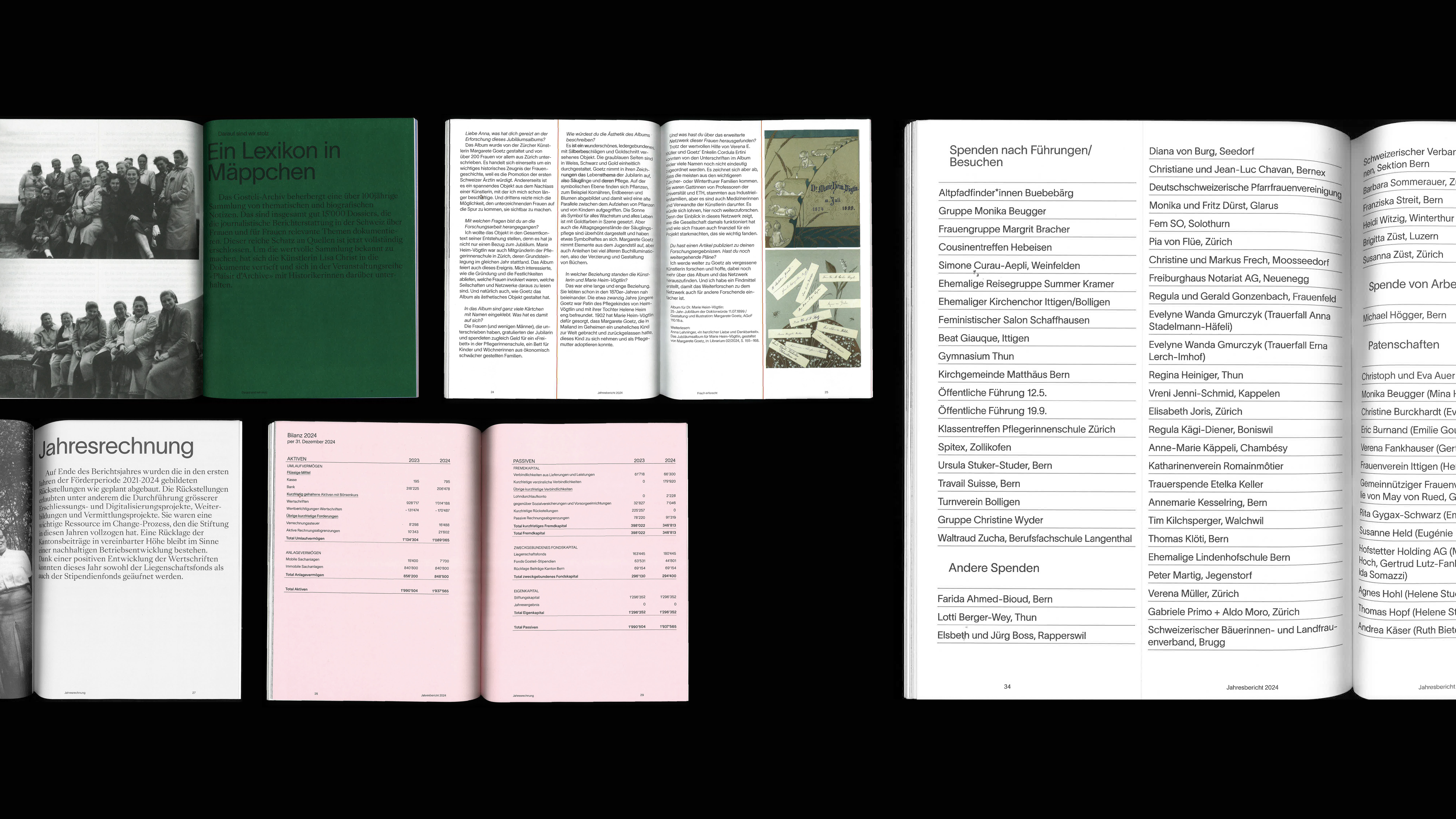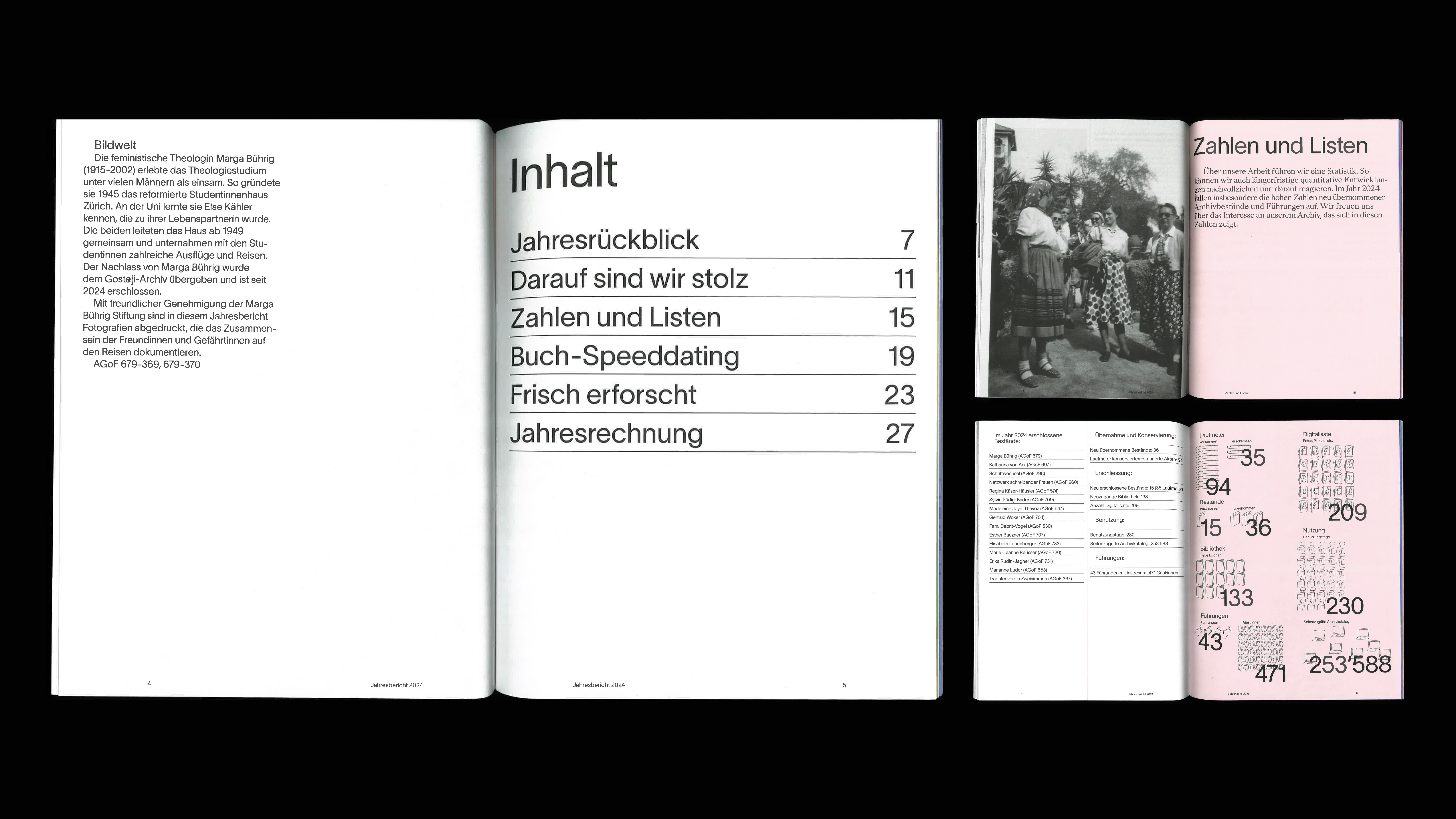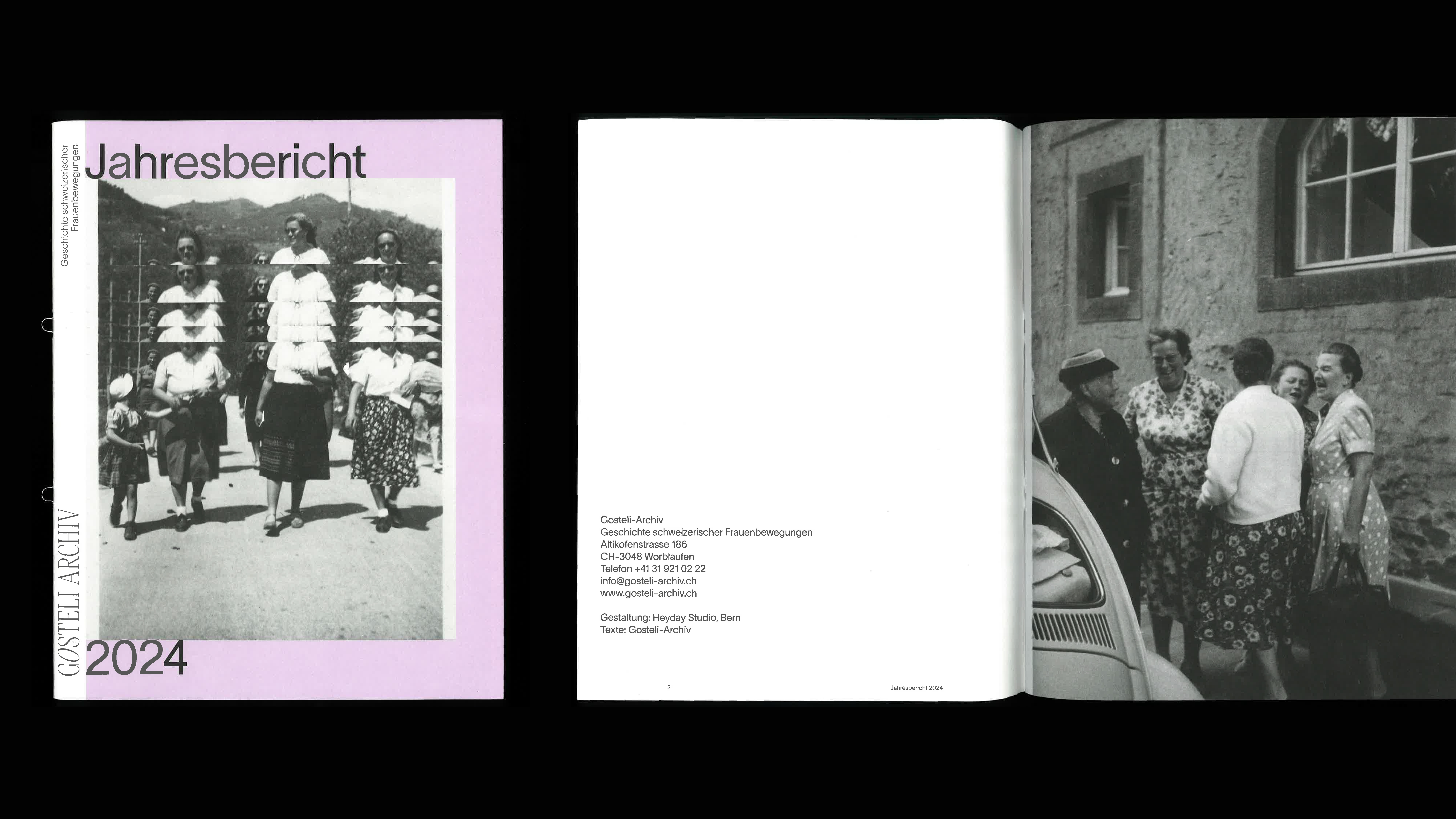 Approach: The new annual report is based on the new visual identity for the Gosteli Archive, which was also developed by Heyday. Working closely with the archive staff, we developed a clear, informative, and comprehensible format for the annual report so that the various topics and areas could be presented in a structured and understandable way. The series of images (each year on a different theme) and the strong, striking colors form the visual framework, supporting the structure and adding a touch of lightness. We chose the type area so that it is easy for the reader to read and quickly get an overview. As a little gem, we added special wire staple binding so that the publication can also be hung up (in an archive folder).