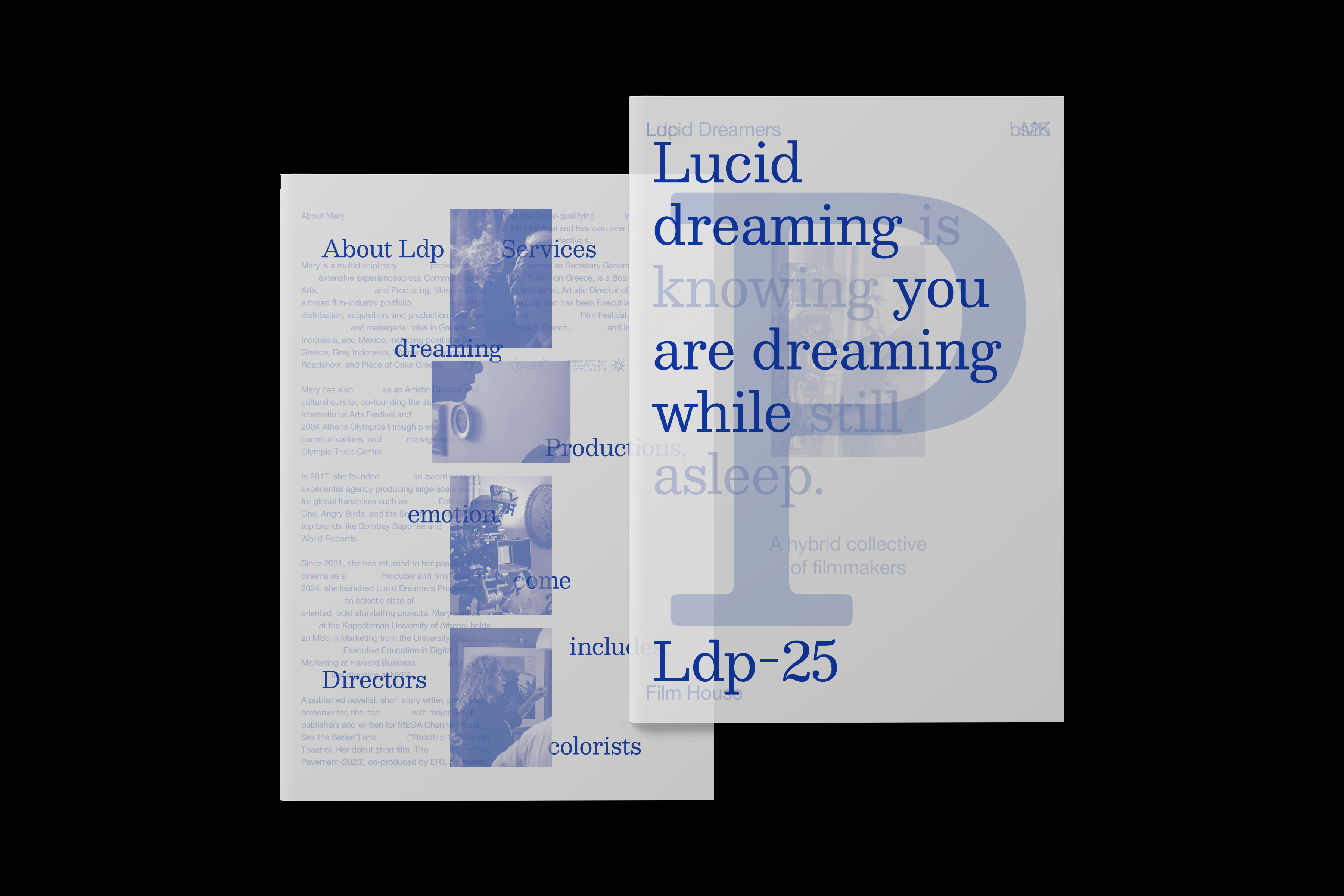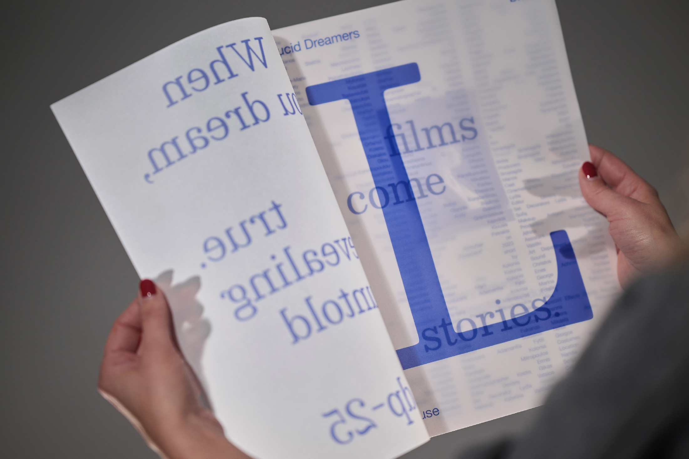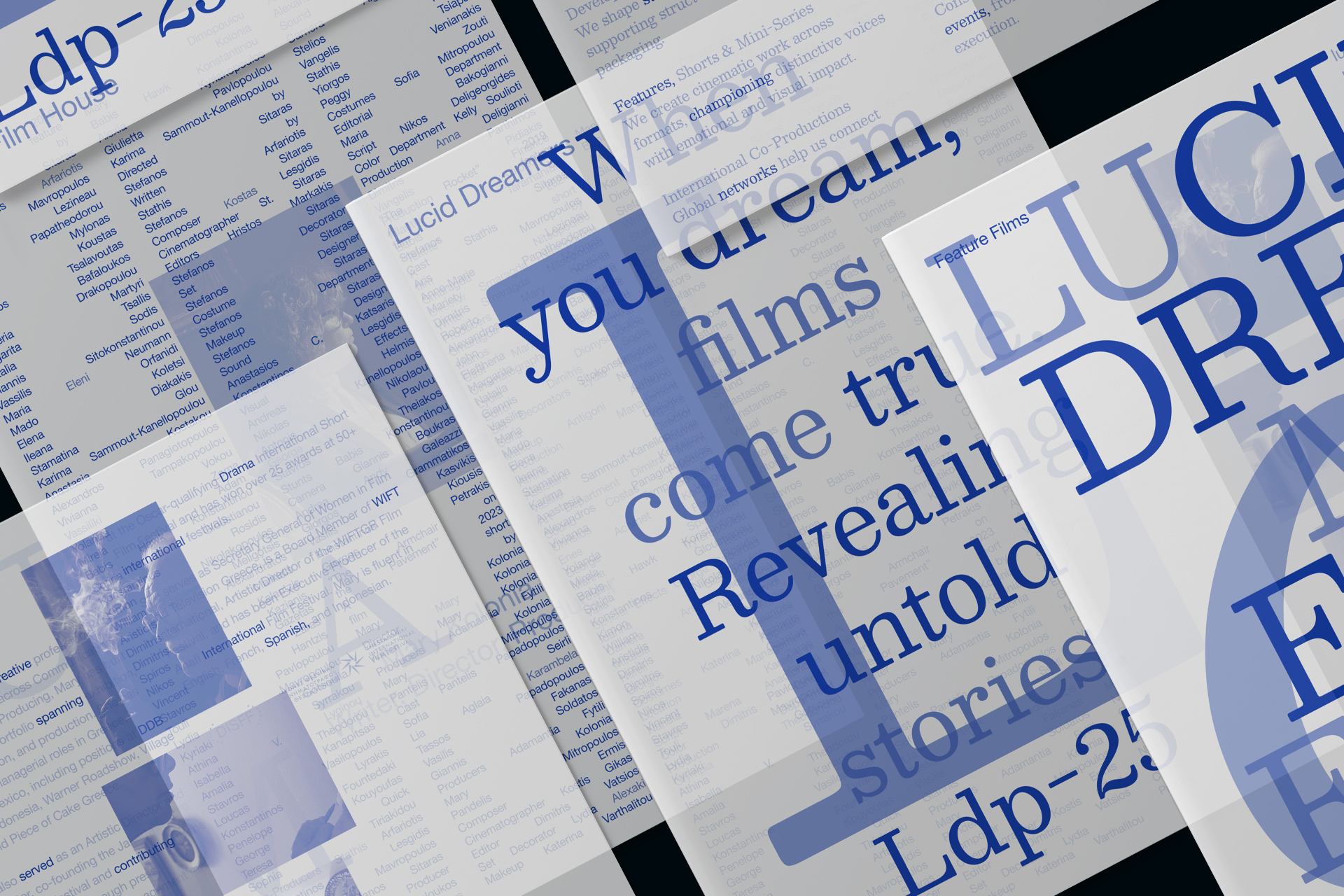 Lucid dreaming is knowing you are dreaming, while still asleep and the name of a film production company. The 2025 Lucid Dreamers Productions brochures, printed on translucent paper, capture the transient state between dream and reality, as layered words and images merge to form a lucid coherent message.