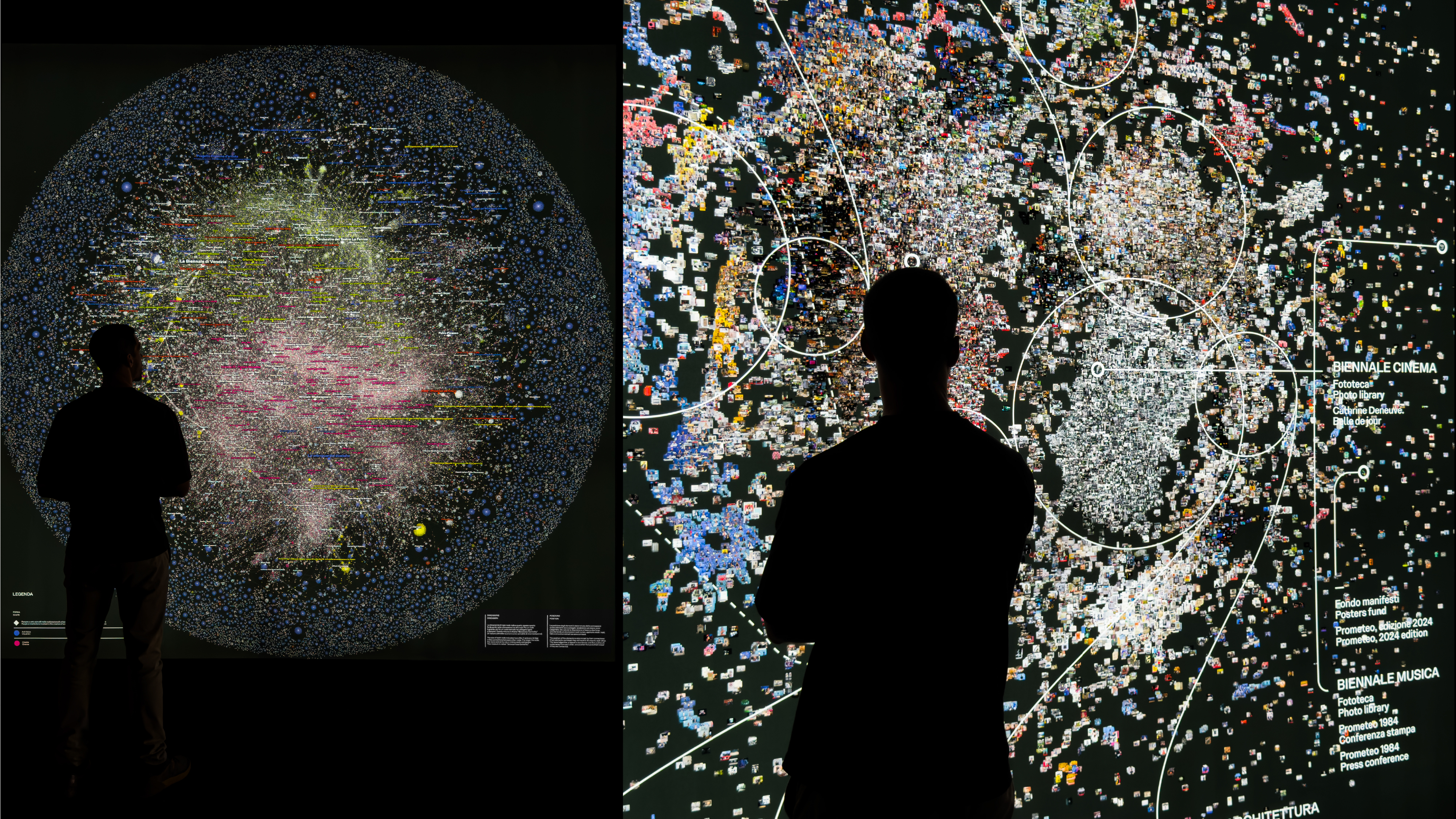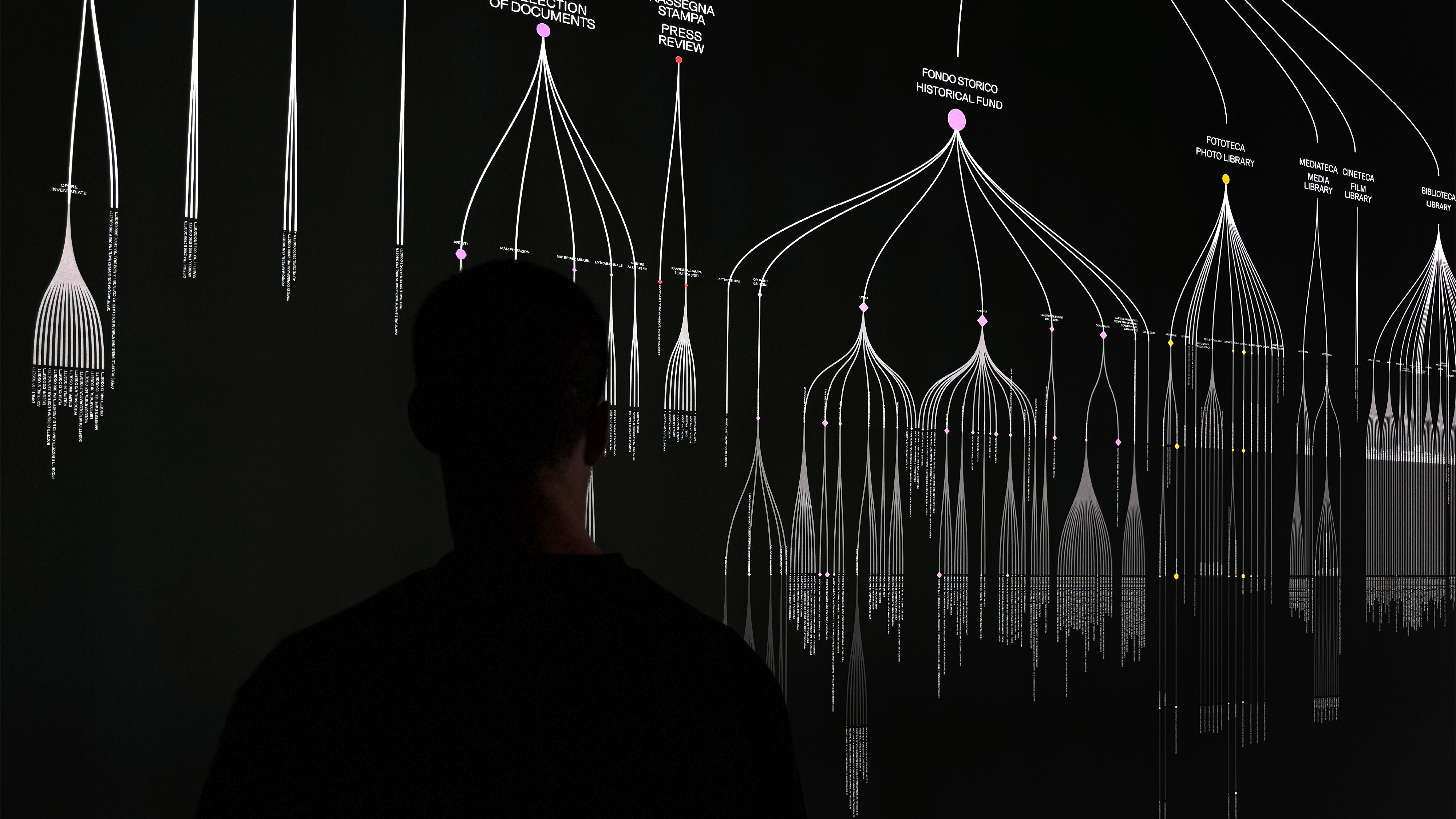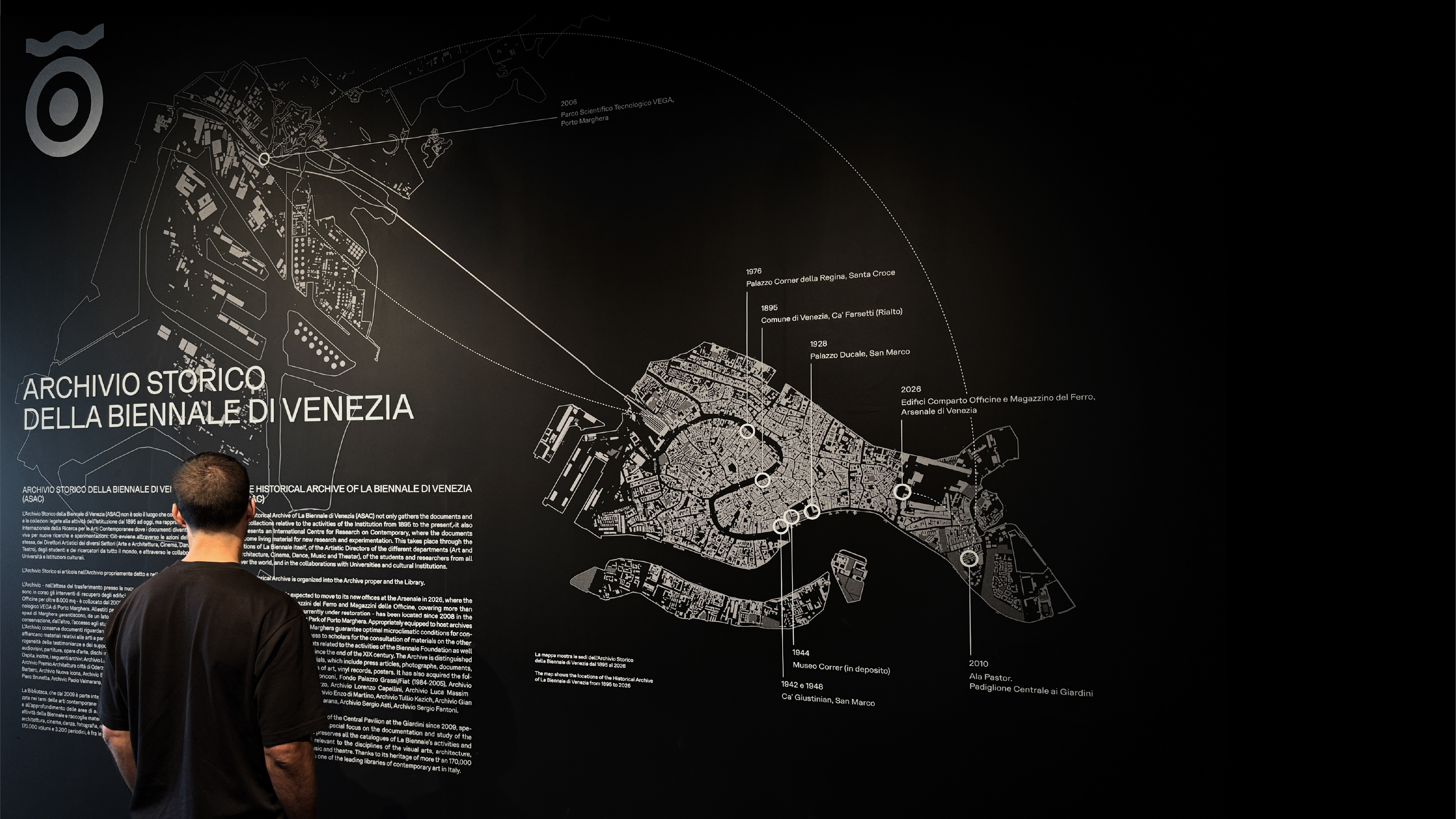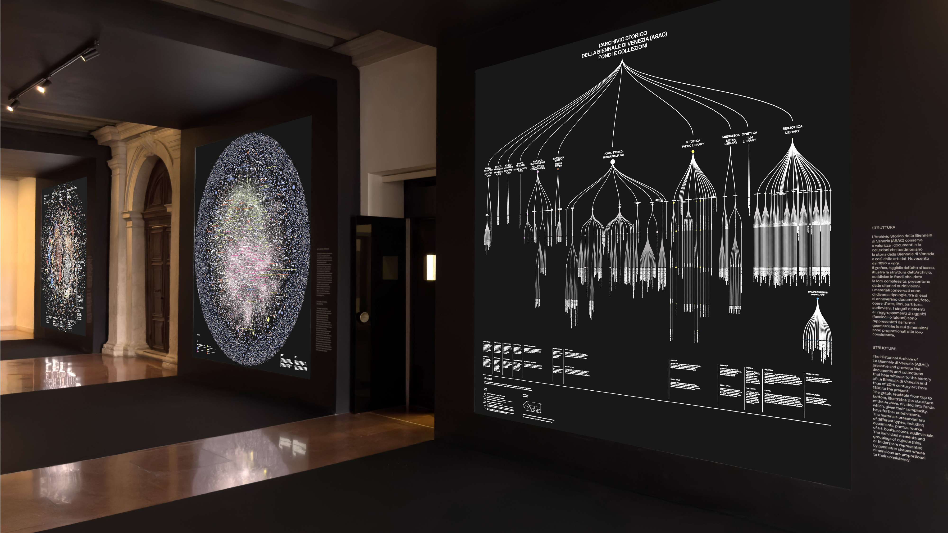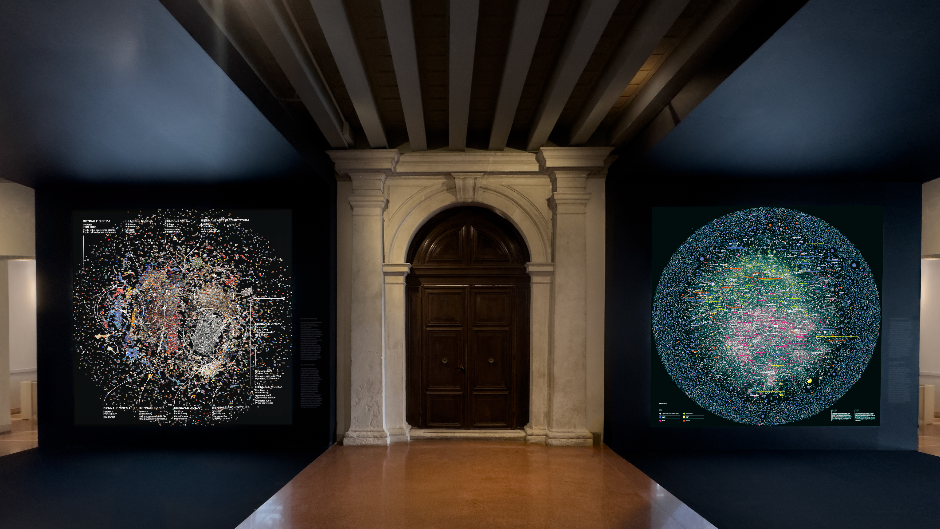 The infographic and data-visualisation project developed for the exhibition Archive & The City at the Venice Architecture Biennale explores new visual scenarios for representing and reorganising the vast historical archive of La Biennale di Venezia. Three large backlit data walls stand within the three portals along the nave of the Biennale headquarters. At either end, two smaller rooms create complementary experiences: one presents an engaging animated infographic; the other (shaped by months of selection work inside the archive) seeks to connect artefacts and trails of related materials embedded in the archival method itself, through physical objects and wall graphics. Three icons identify the three sections.