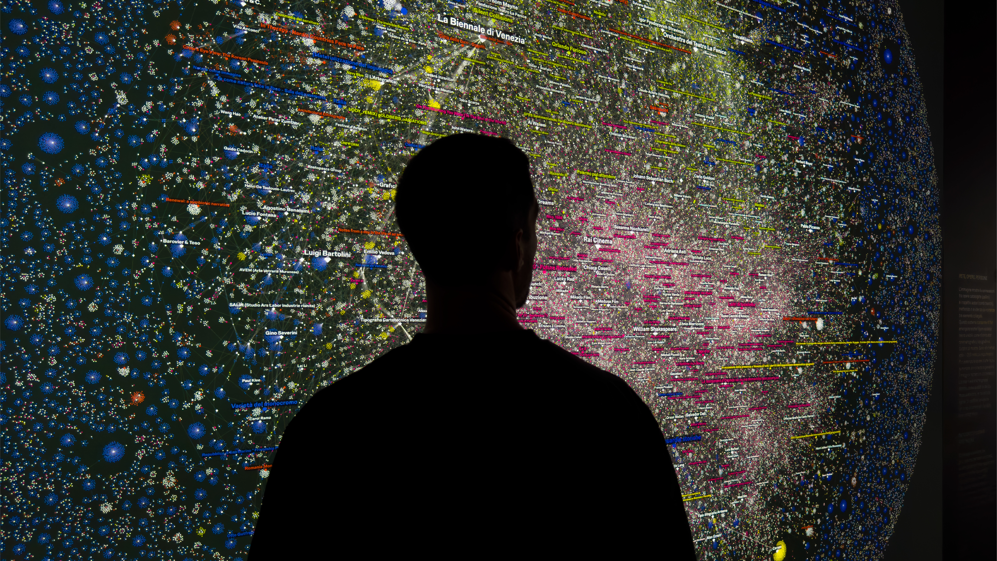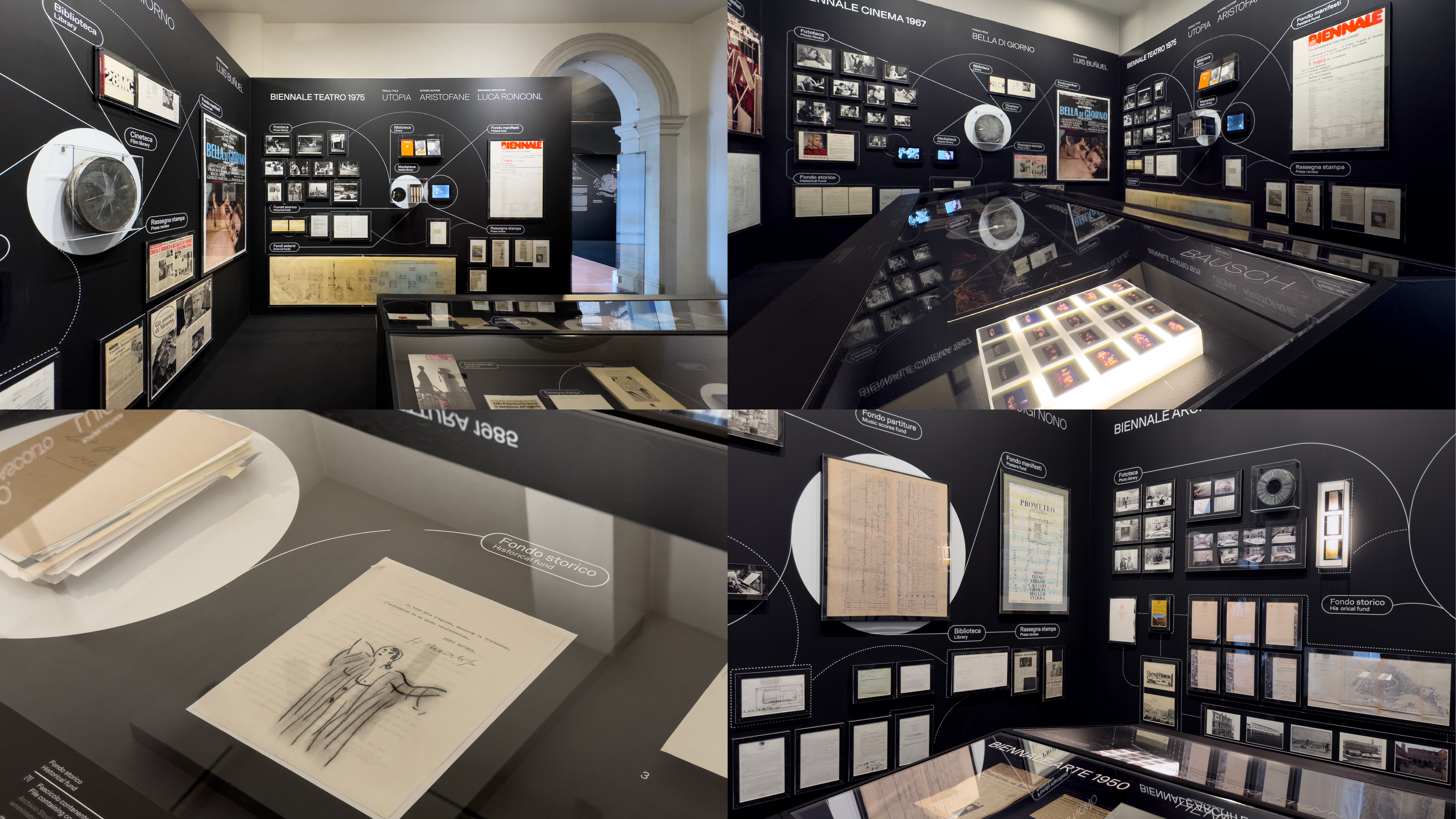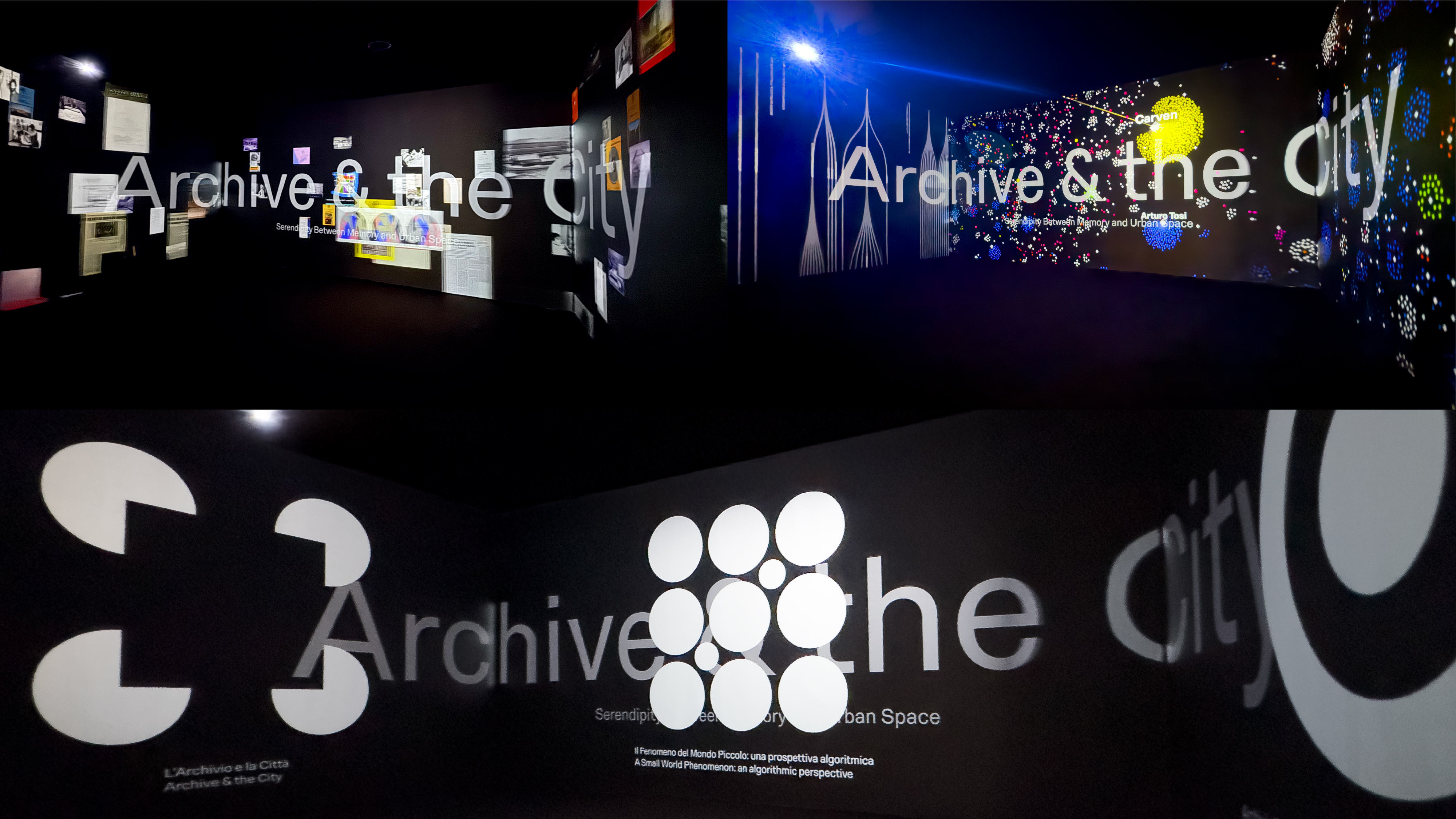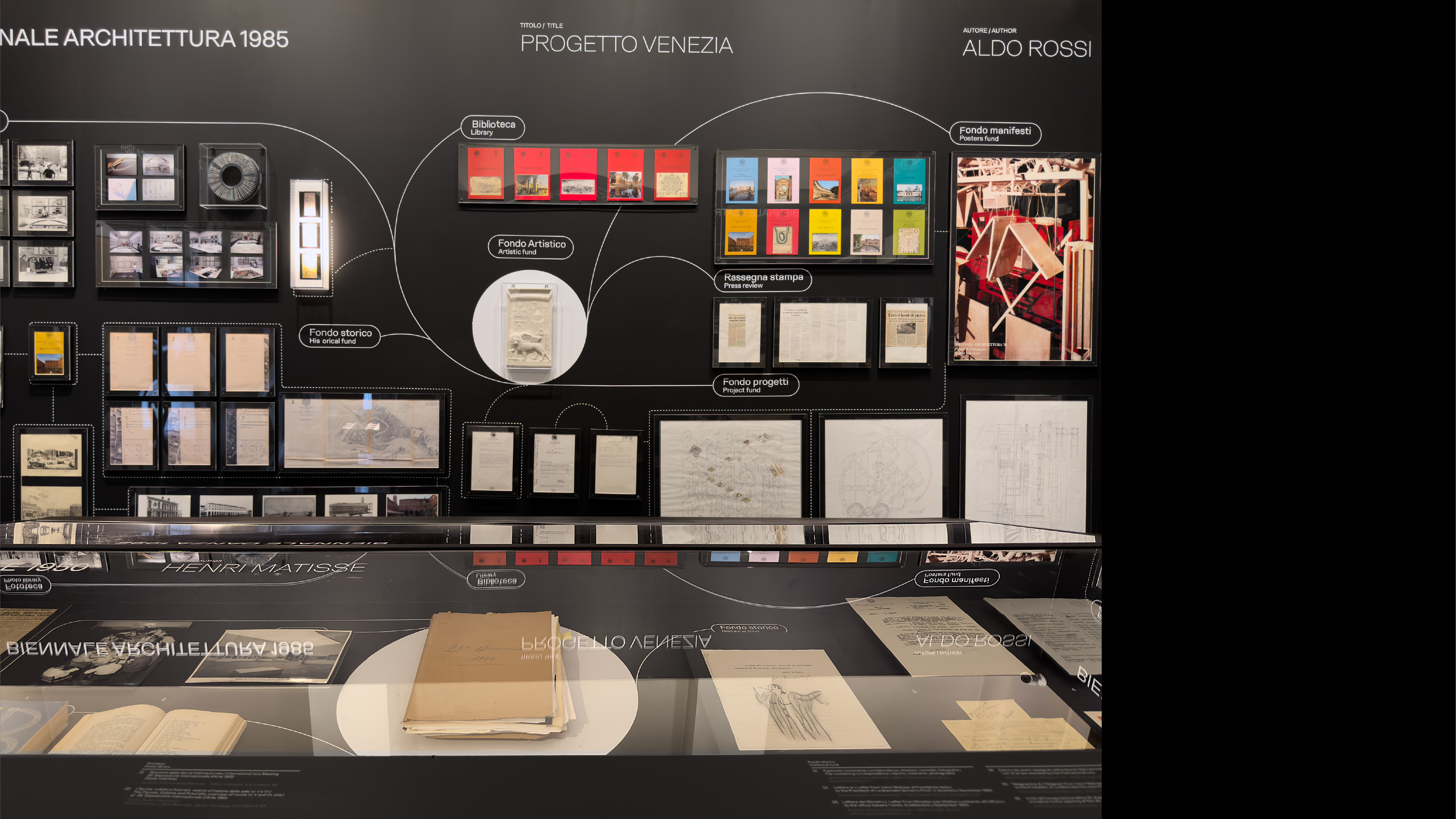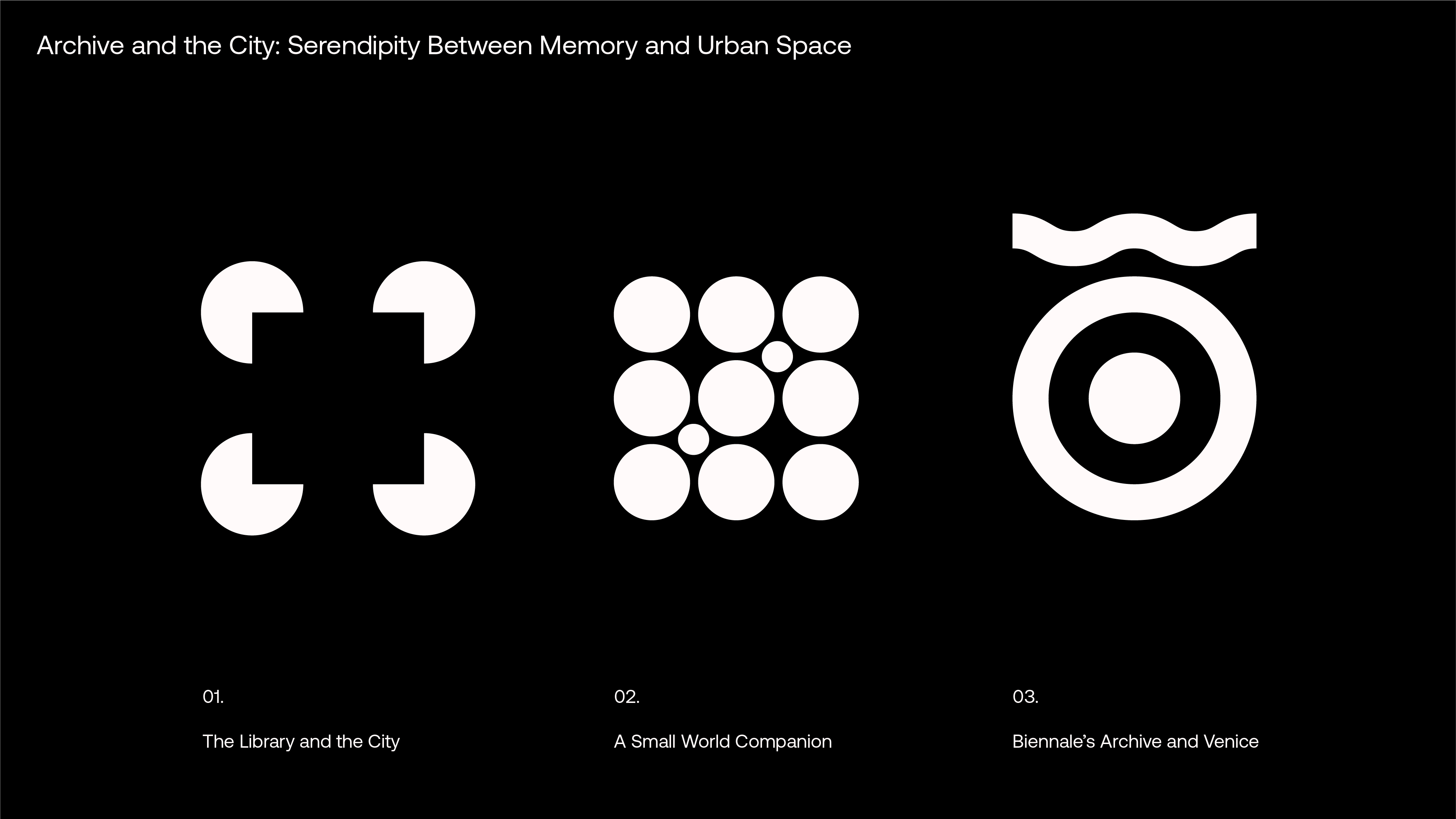 The infographic and data-visualisation project developed for the exhibition Archive & The City at the Venice Architecture Biennale explores new visual scenarios for representing and reorganising the vast historical archive of La Biennale di Venezia. Three large backlit data walls stand within the three portals along the nave of the Biennale headquarters. At either end, two smaller rooms create complementary experiences: one presents an engaging animated infographic; the other (shaped by months of selection work inside the archive) seeks to connect artefacts and trails of related materials embedded in the archival method itself, through physical objects and wall graphics. Three icons identify the three sections.