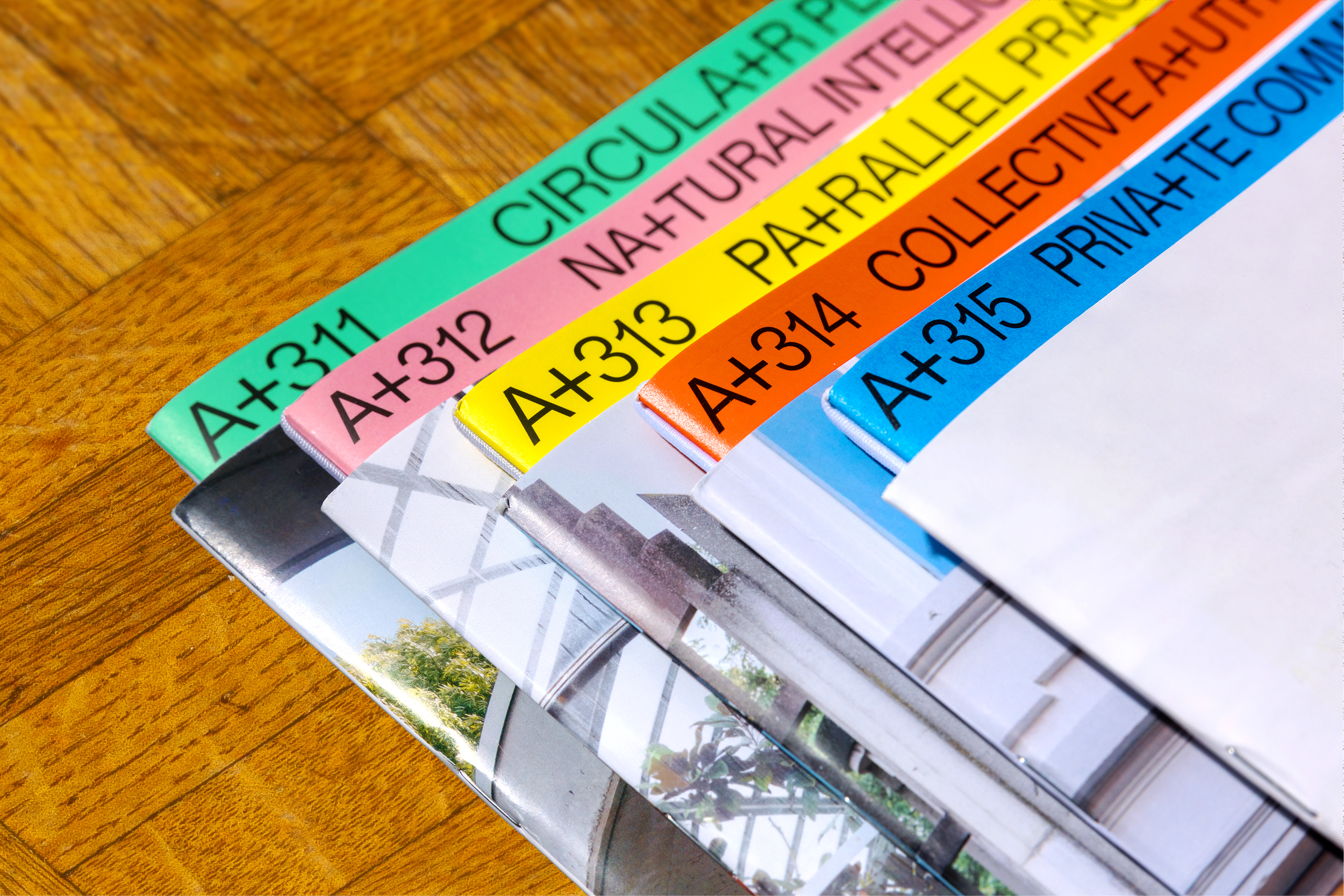 Instead of redesigning the layout, we redefined the object. A+ was physically split into two autonomous parts: a project section and a thematic section. Held together by an elastic band, the publication becomes flexible, expandable and open to intervention. Inserts and additional booklets can be added without disturbing the system.
