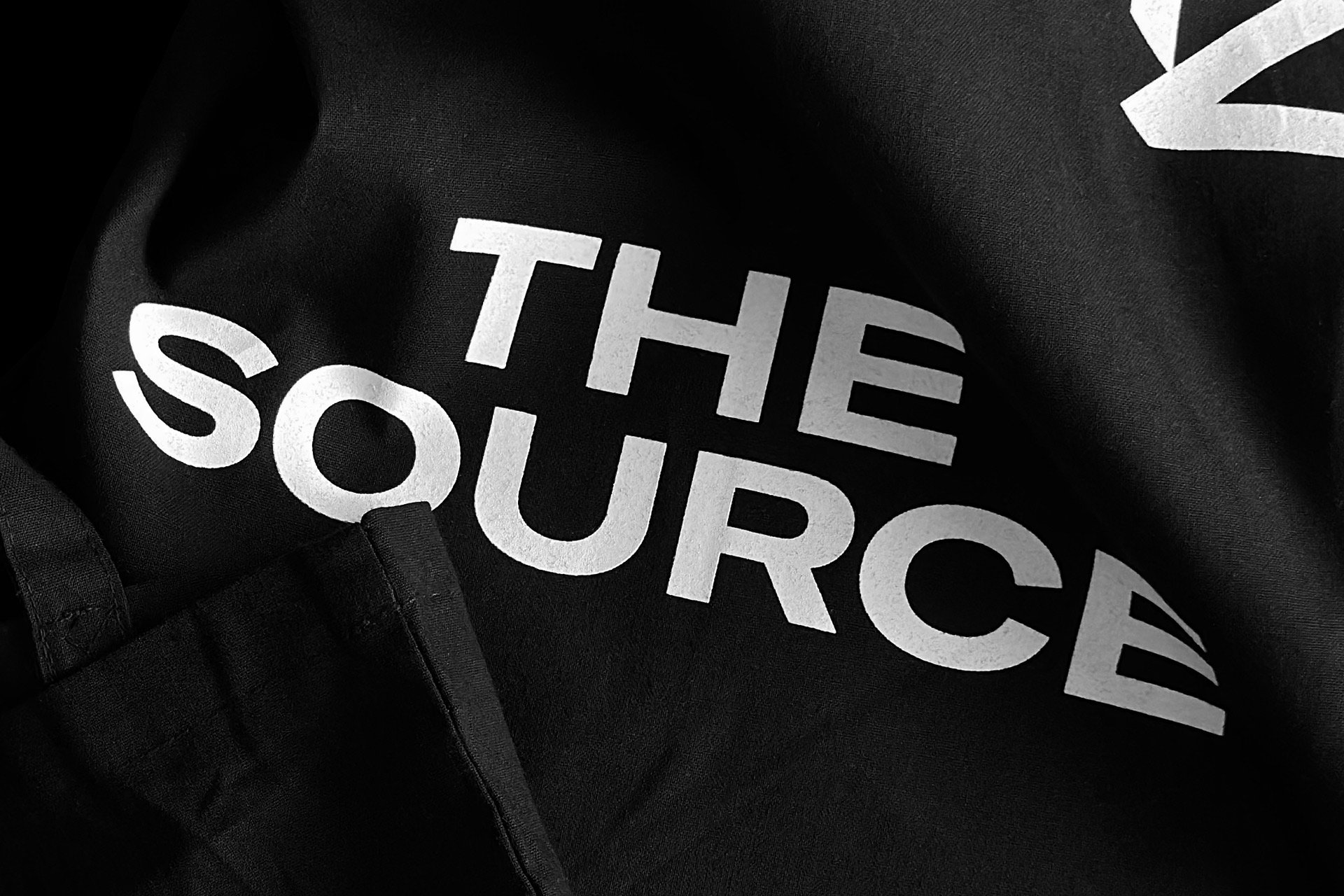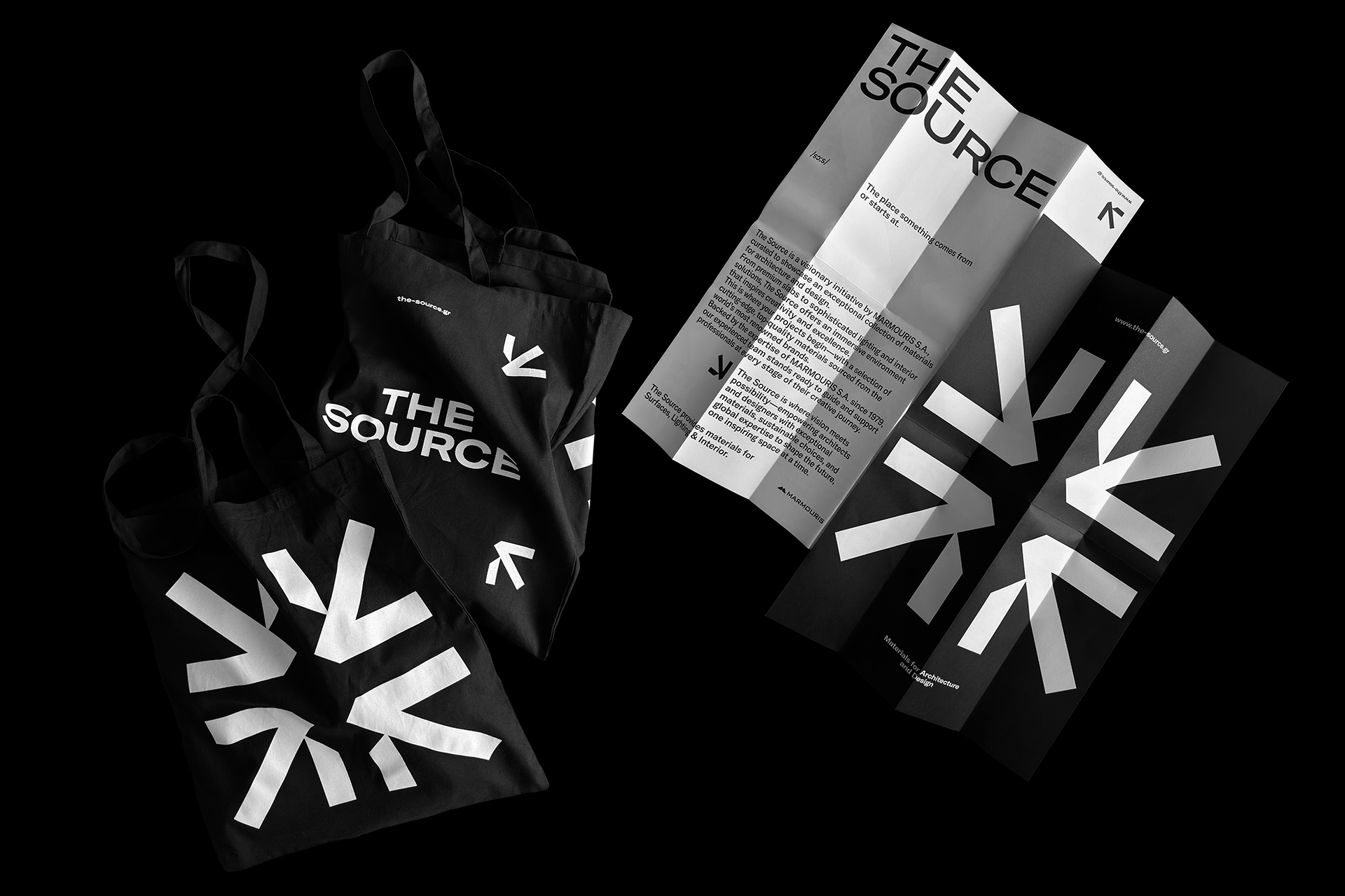 The four arrows do not merely point; they anchor the brand within the architectural space, effectively framing the environment. With a rigorous geometry reminiscent of technical drawings, they visually signify that The Source is the singular wellspring for the most compelling architectural materials.