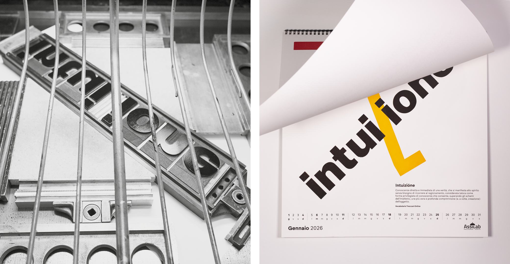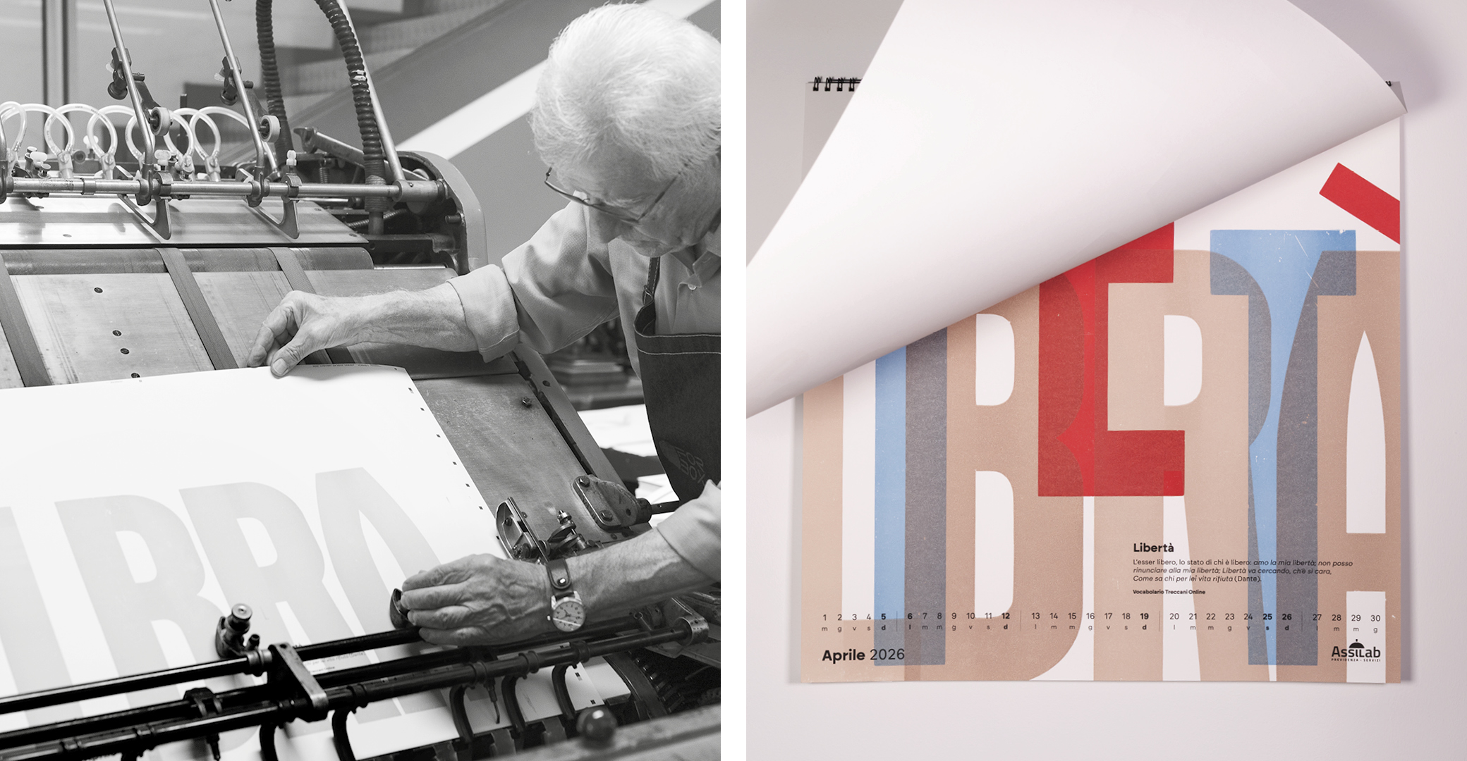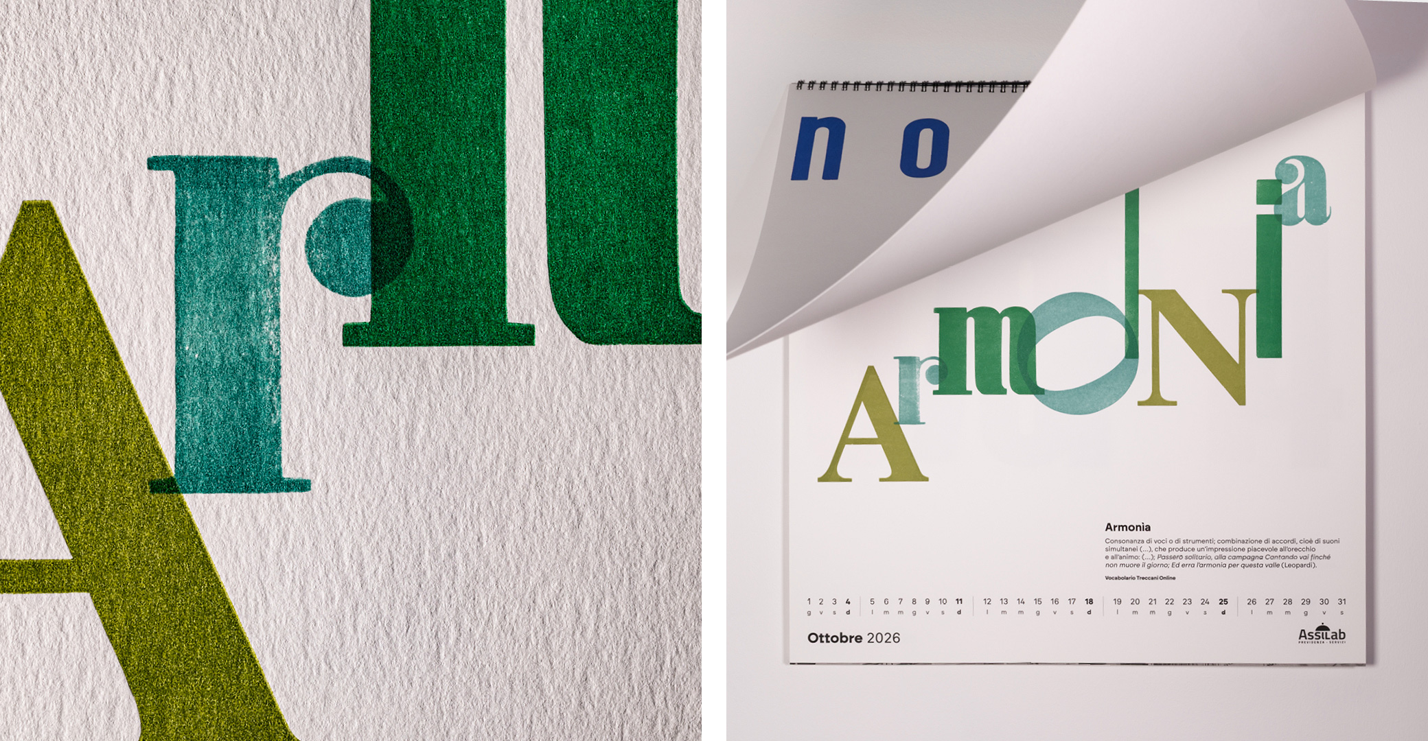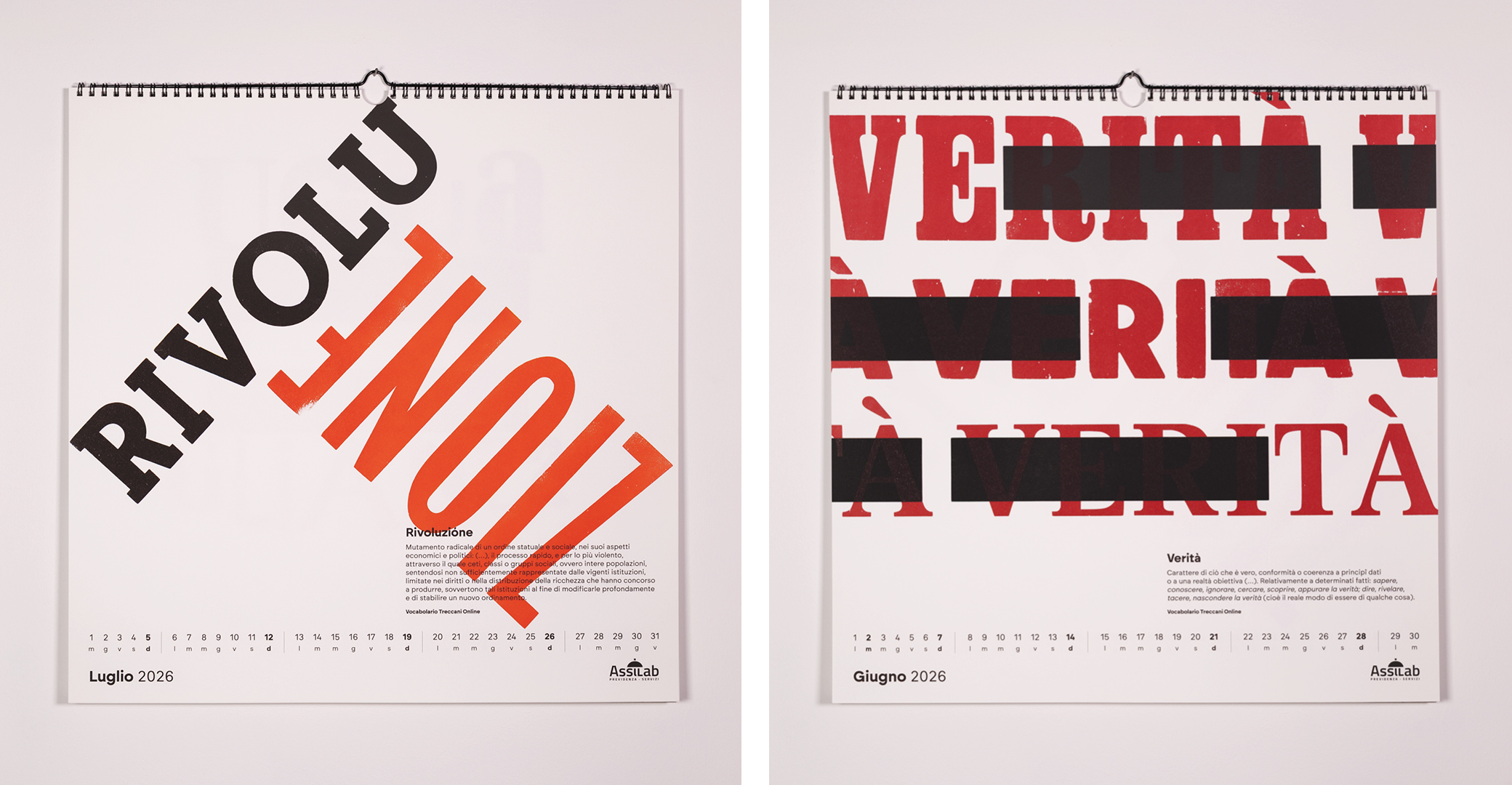 Parole al muro is an editorial and typographic project that explores the fundamental value of italian language: words as tools of transformation, memory, and identity. The calendar brings together twelve words selected in collaboration with Treccani Institut as conceptual focal points: each word becomes a visual device, capable of generating cultural content and graphic form.