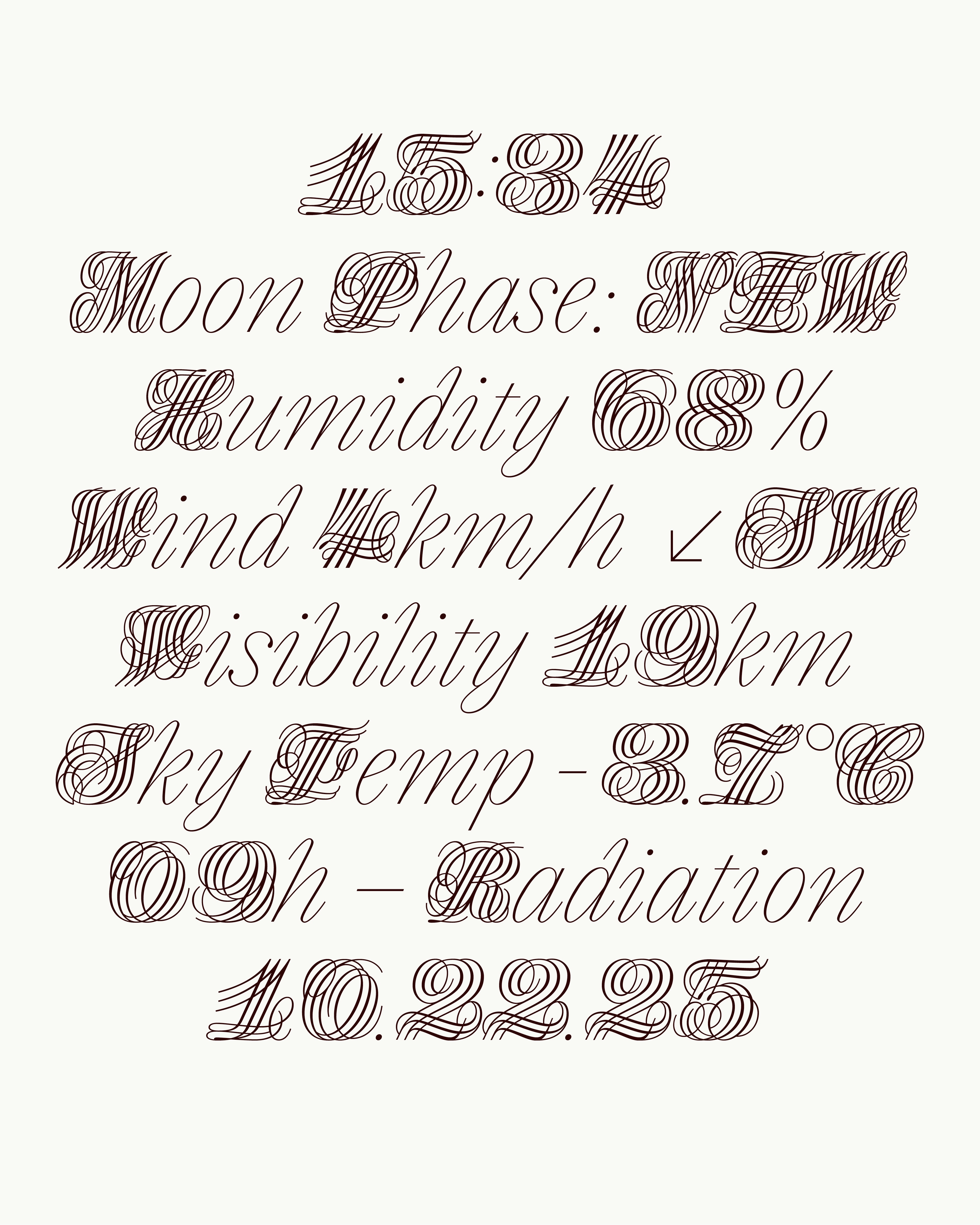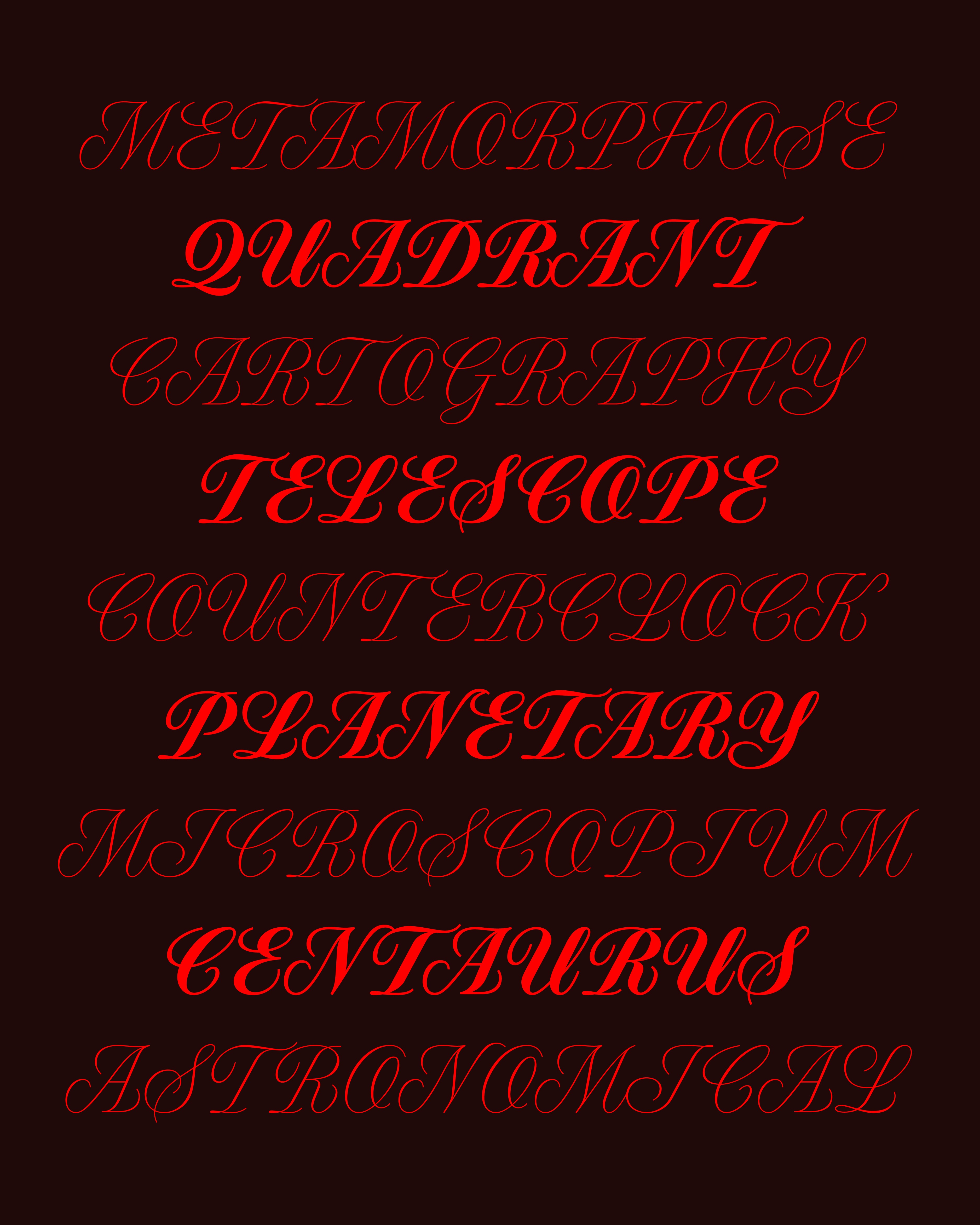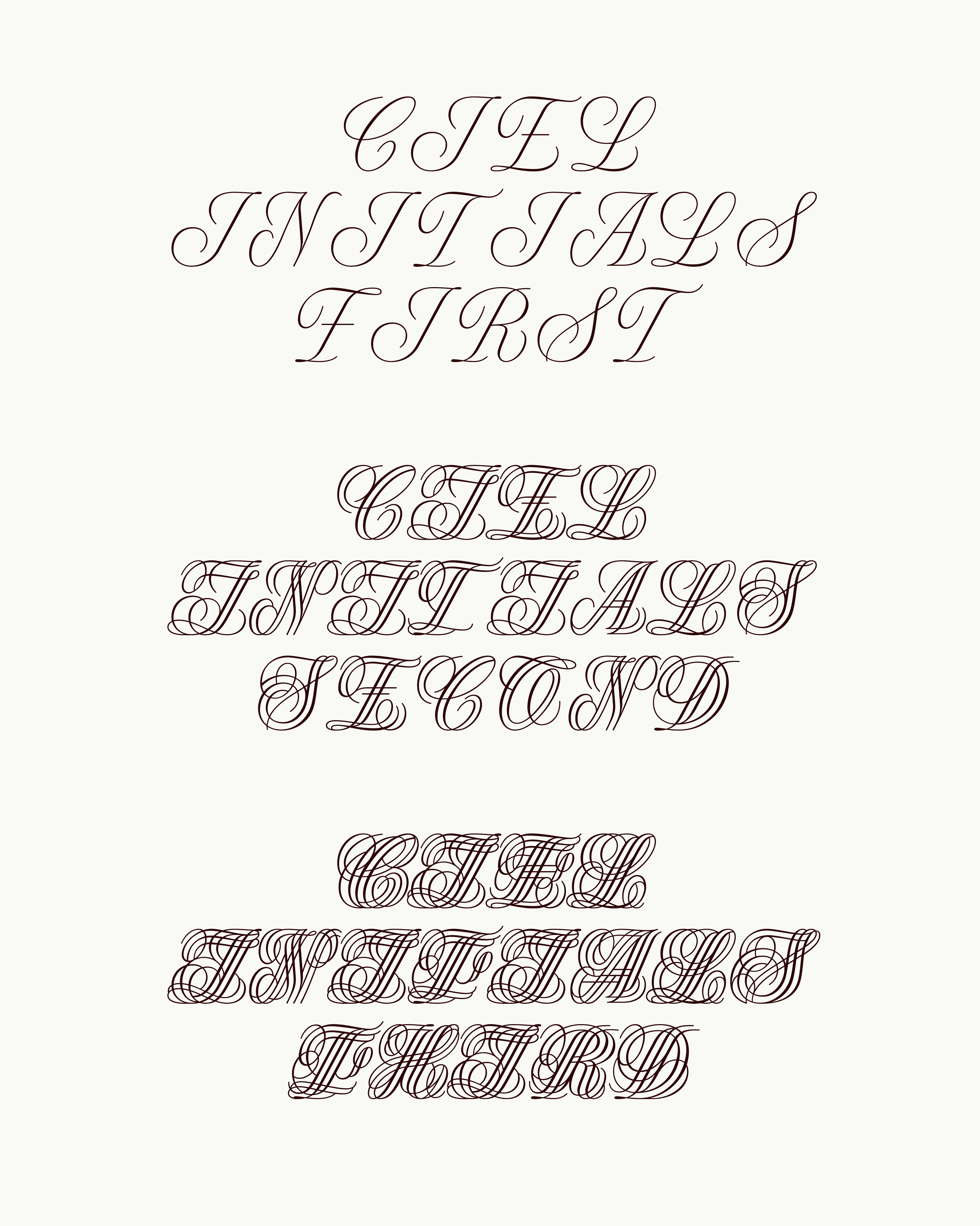 Ciel is a high-contrast typeface family that exists at the intersection of word and image, where ornament is not only decorative but the very condition of meaning. Rooted in the structural elegance of copperplate calligraphy, the family features a five-weight range of base faces alongside a thick ornamental layer of three initial styles. These initials are knotted into dense, monospaced squares, transforming the linguistic sign into a signifying image, creating a visual tapestry of interwoven capitals that captures attention through a semiotics of affect before the text is even read.