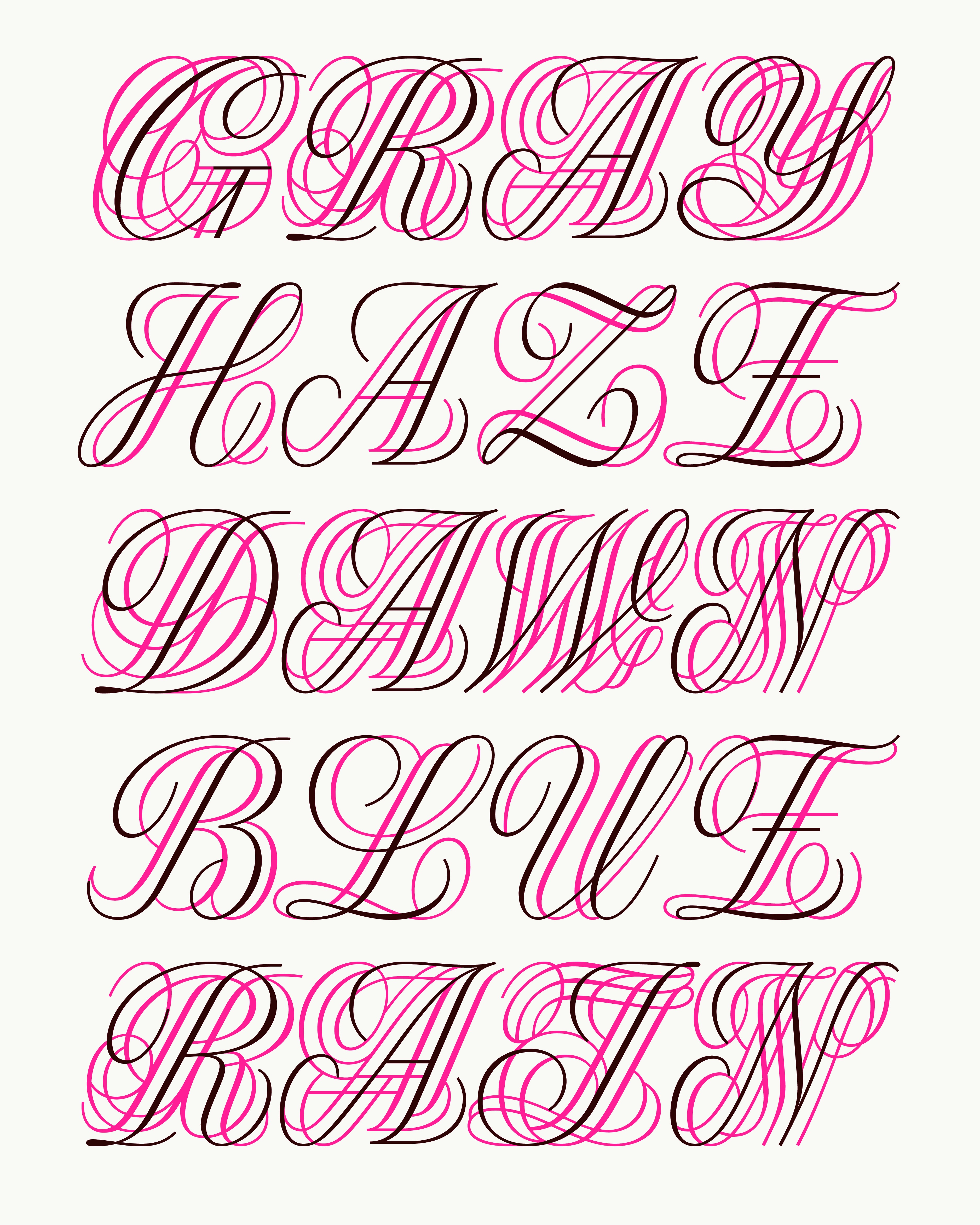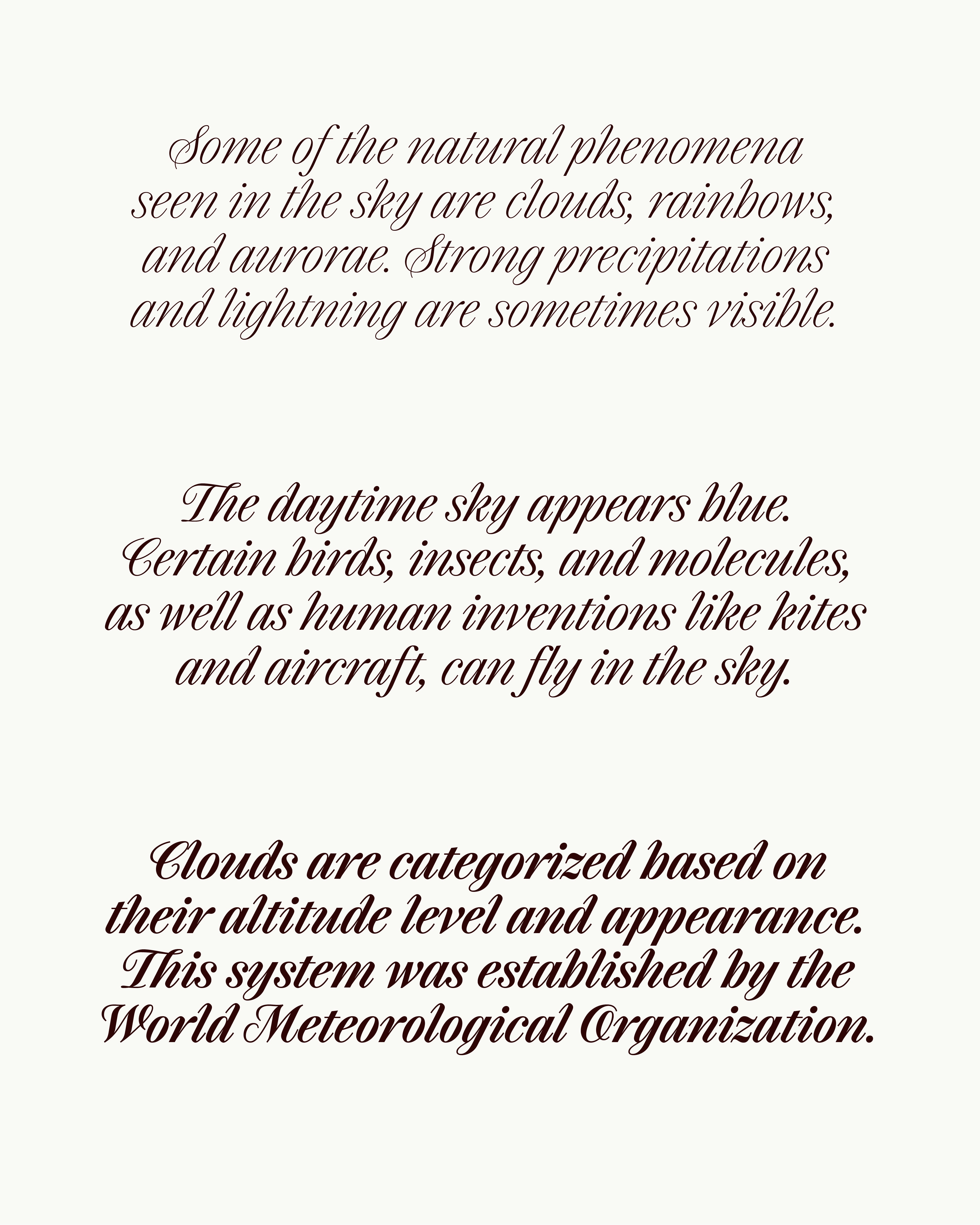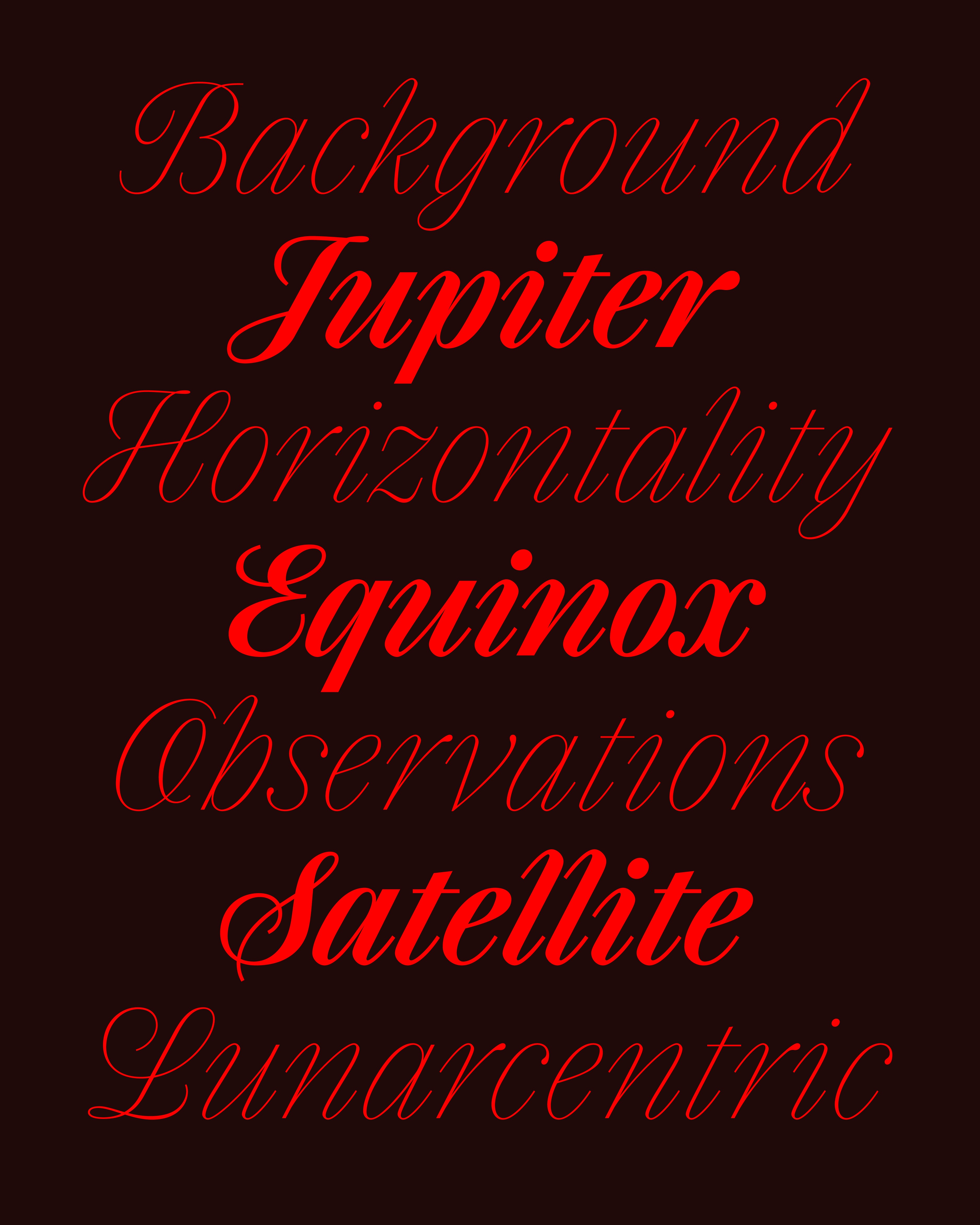 Ciel is a high-contrast typeface family that exists at the intersection of word and image, where ornament is not only decorative but the very condition of meaning. Rooted in the structural elegance of copperplate calligraphy, the family features a five-weight range of base faces alongside a thick ornamental layer of three initial styles. These initials are knotted into dense, monospaced squares, transforming the linguistic sign into a signifying image, creating a visual tapestry of interwoven capitals that captures attention through a semiotics of affect before the text is even read.