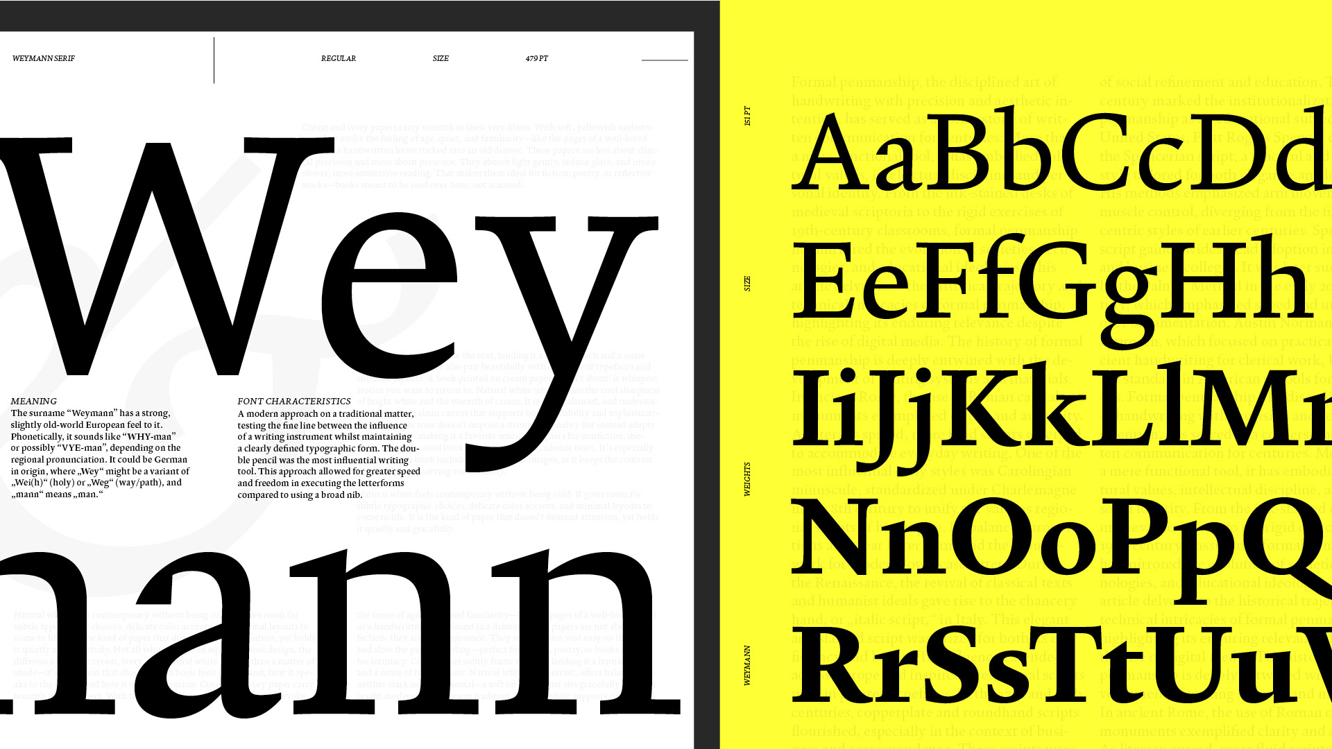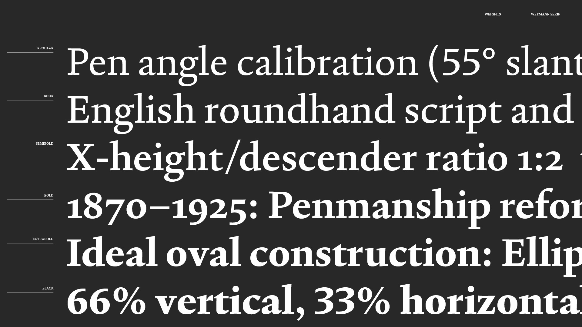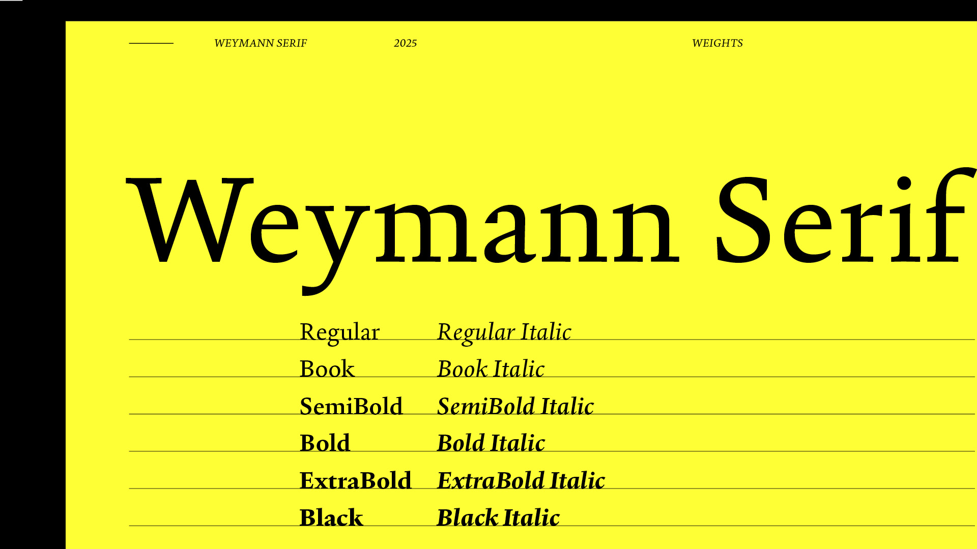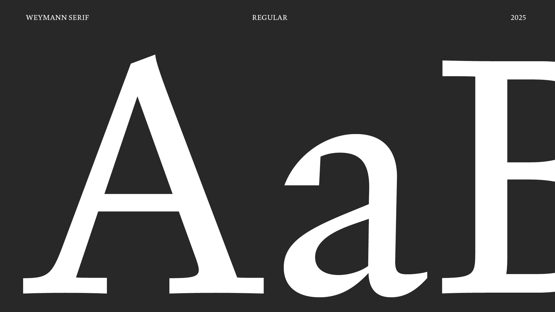 Weymann Serif is a typeface for text meant to last, to be read not just once, but well. Drawing its breath from the hand, it speaks with the composure of type. Beyond its typographic discipline, rational and precise, lies a meditation on the act of writing, refined, balanced and without flourish. Weymann Serif performs without performance, engaging eye and page quietly and unmistakably.