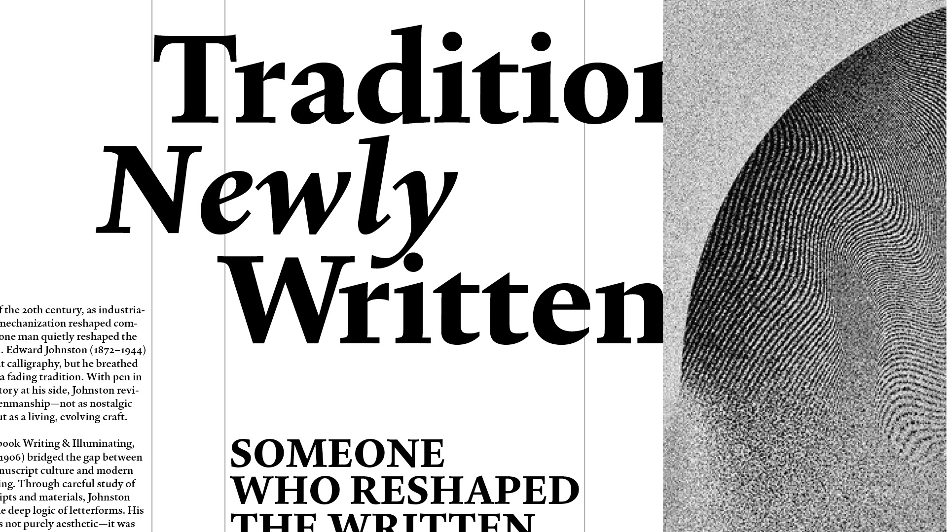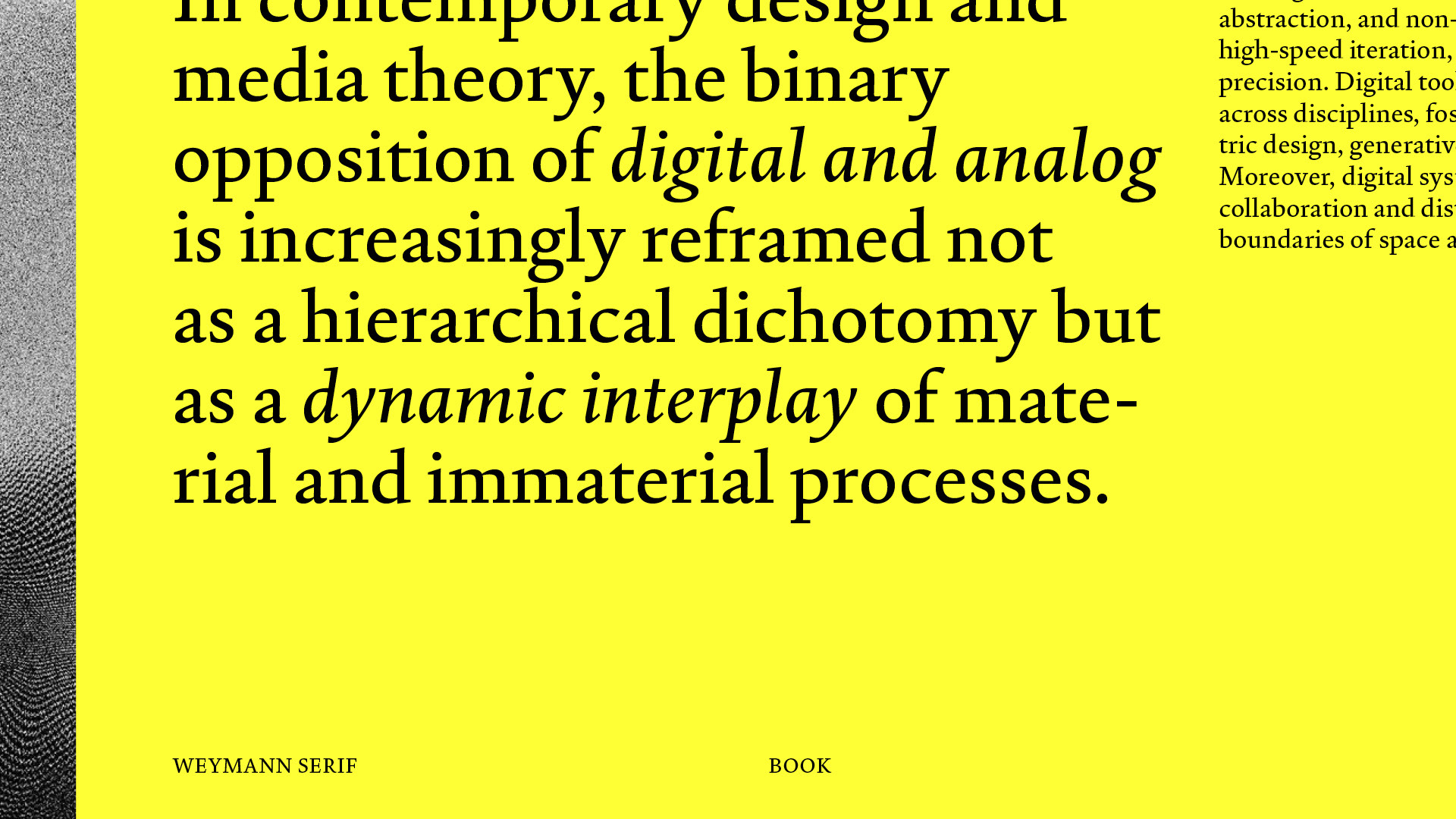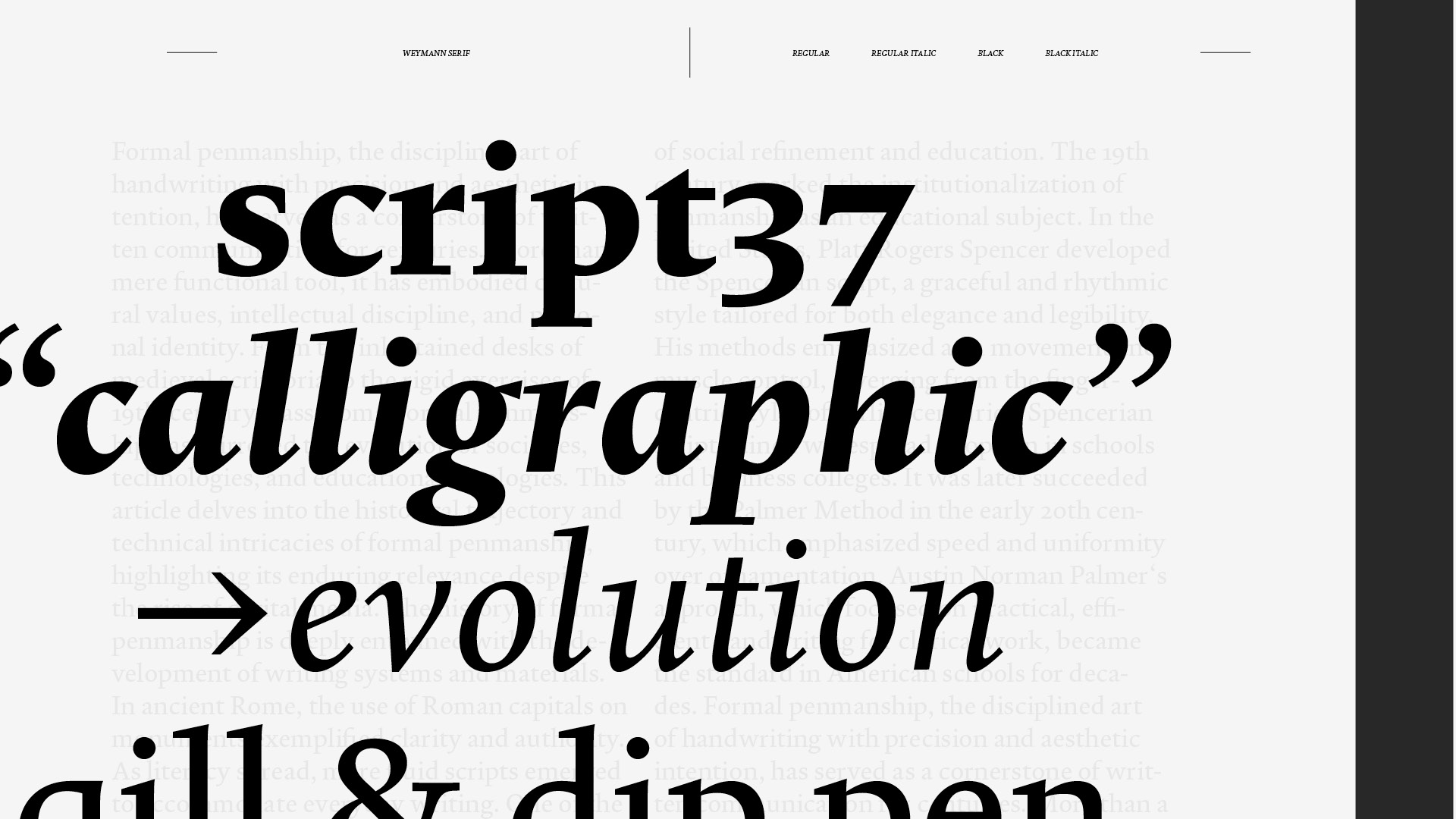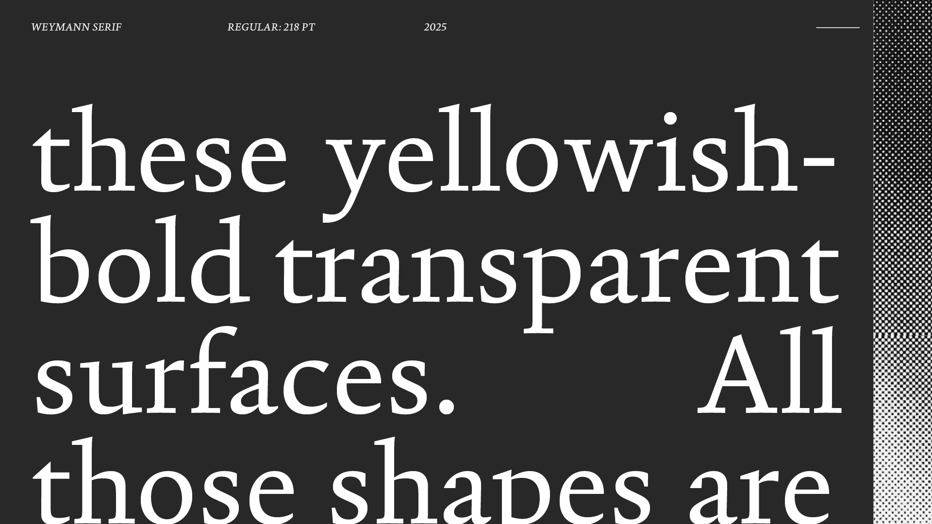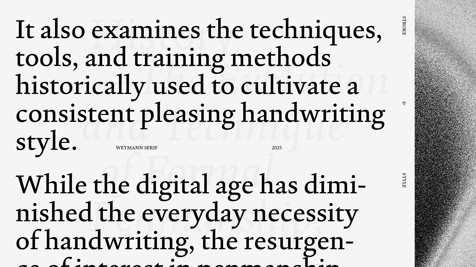 Weymann Serif is a typeface for text meant to last, to be read not just once, but well. Drawing its breath from the hand, it speaks with the composure of type. Beyond its typographic discipline, rational and precise, lies a meditation on the act of writing, refined, balanced and without flourish. Weymann Serif performs without performance, engaging eye and page quietly and unmistakably.