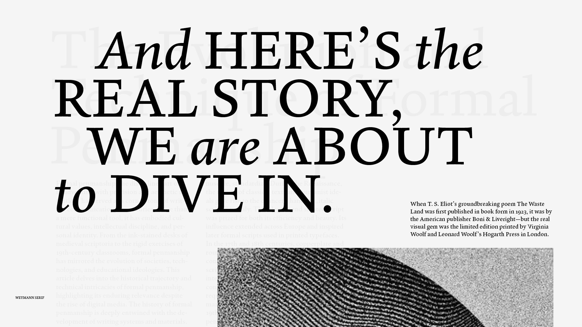 Weymann Serif’s exceptional legibility reflects that it was designed and made for reading. It is balanced and unflappable in books, journals, catalogues and essays; at ease in modern editorial work; and on the cover of a traditional volume you return to again and again.