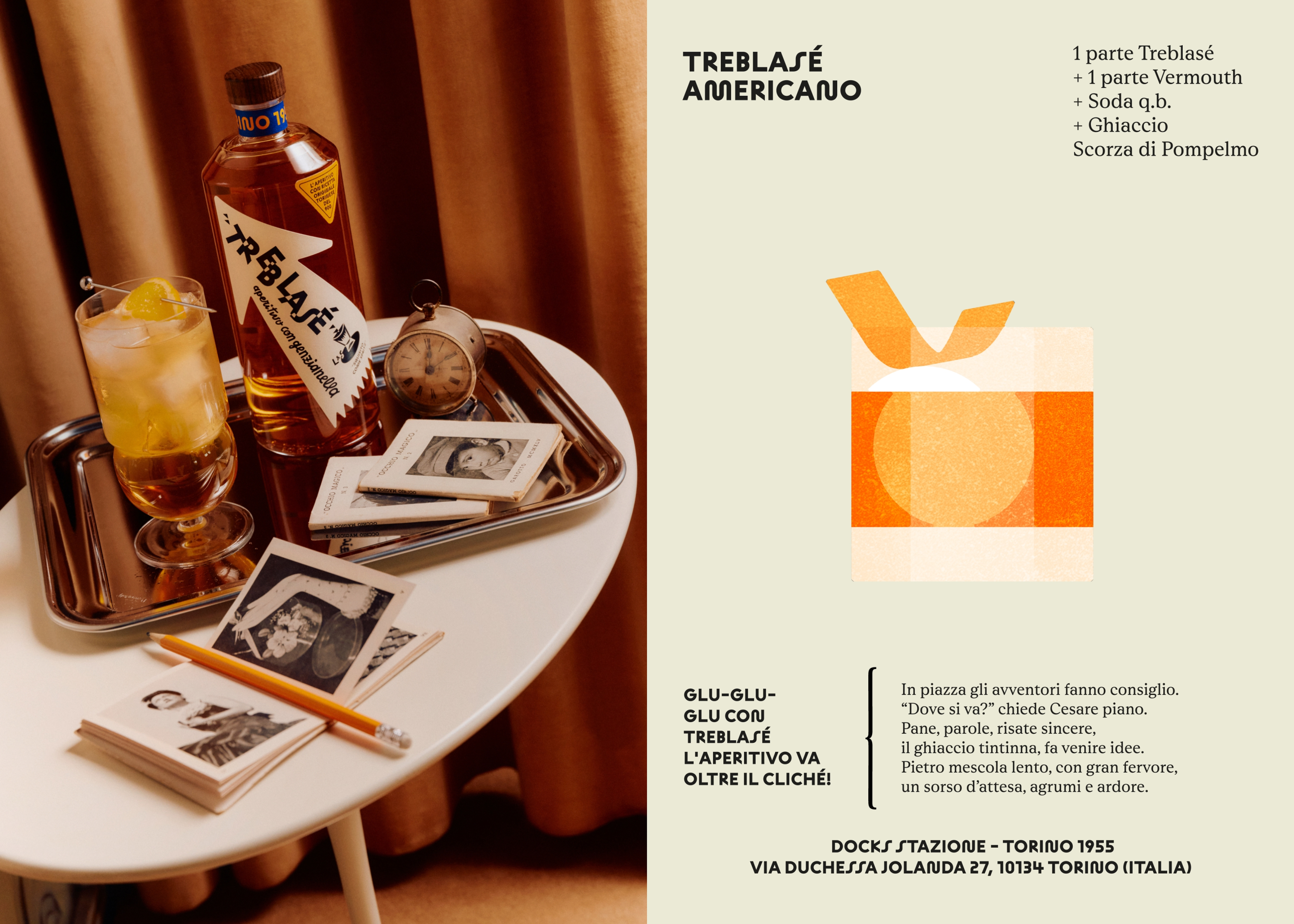Treblasé takes the aperitivo in a new direction. The spritz, with its recent international success has become a symbol of the Italian lifestyle, but in Italy, it has sparked a counter-movement: new Italian brands are looking inward, rediscovering historical roots, forgotten recipes, and locally sourced ingredients to reclaim depth and identity to expand the regional expression. Within this context, Turin holds a significant role as the birthplace of aperitivo. In 1926, Fortunato Depero famously submitted an advertising poster for Campari ‘Squisito al Seltz’ to the Venice Biennale, elevating advertising to art. The image depicted a group of ‘avventori’—people frequenting a bar—almost a replica of a family photograph from Famiglia Bosso Trattoria. This intersection of design history and drink culture explains why the visual language of aperitivo often nods to Futurism, and specifically Fortunato Depero, whose work captures the energy and optimism of aperitivo culture. Too often, these references are used without true cultural connection. Rooted in history yet designed for today, Treblasé reinterprets the aperitivo through the lens of place—celebrating Turin’s legacy while contributing to the evolving language of modern Italian aperitivo.