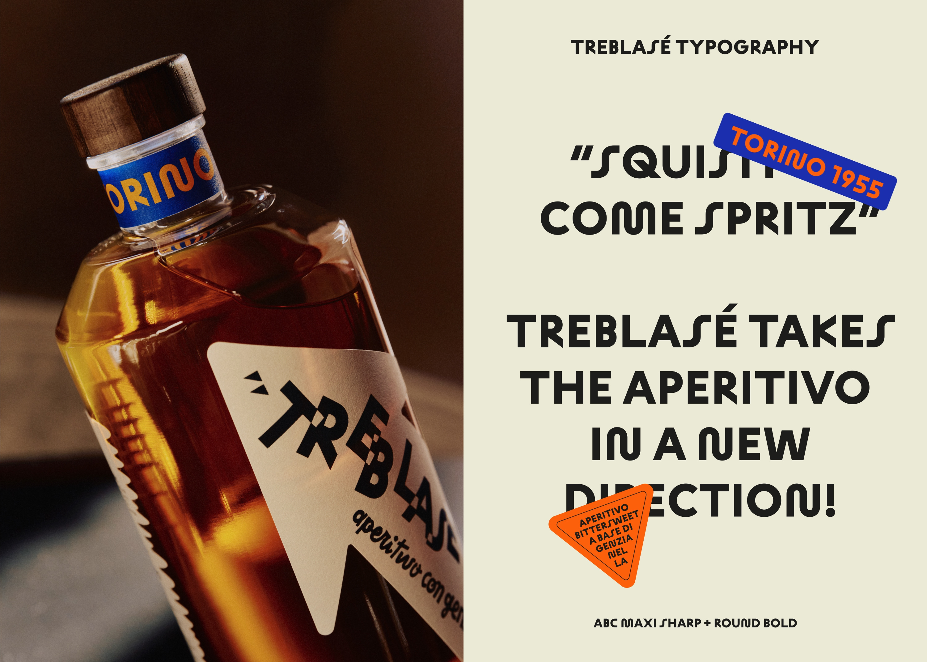 We borrowed from the Futurist vernacular to create a visual language rooted in the history of aperitivo, reinterpreted through a contemporary lens. Typographically, black-and-white contrasts, overlapping all-caps bold type, and dynamic composition evoke a playful and energetic tone. The arrow—unmistakably Depero—symbolizes direction and intention. Onomatopoeia echoes literary and visual Futurism, offering a playful voice. The colour palette is inspired by Genzianella, a deep-blue alpine wildflower rooted in Piedmontese culinary and drinking traditions. The back label suggests three ways to enjoy the aperitif. The bottle is lightweight, with a single-material cork and threads carved directly into the wood to avoid plastic. Treblasé positions itself at the intersection of heritage and reinvention, speaking to a contemporary aperitivo culture while remaining unmistakably Torinese in spirit.