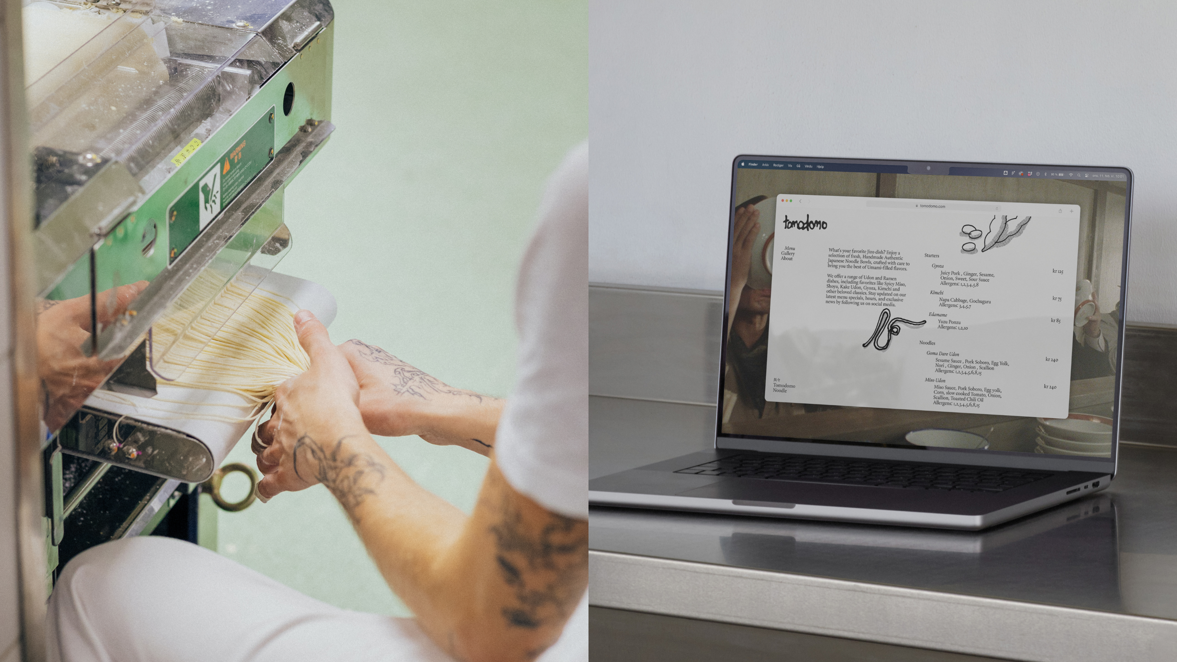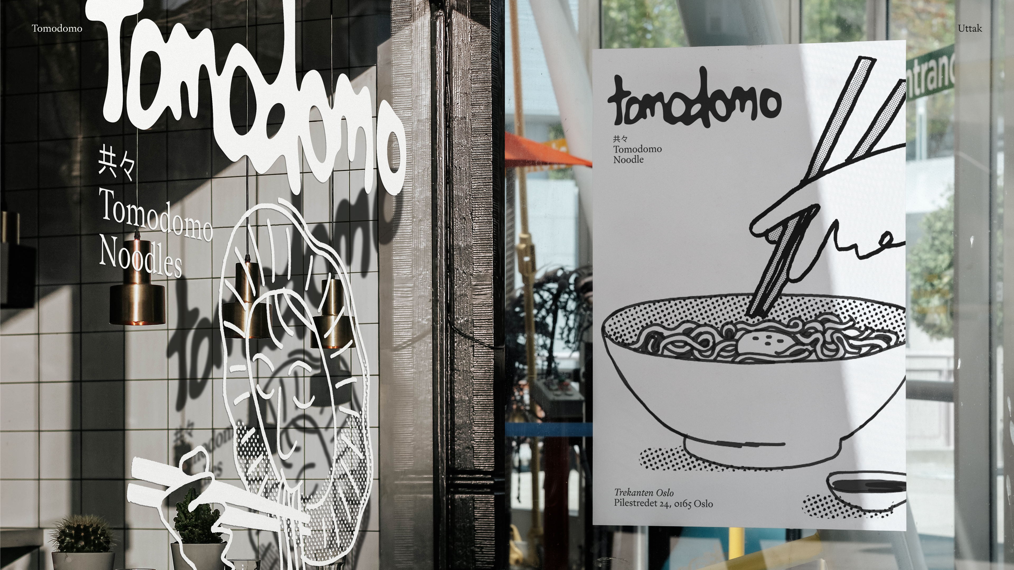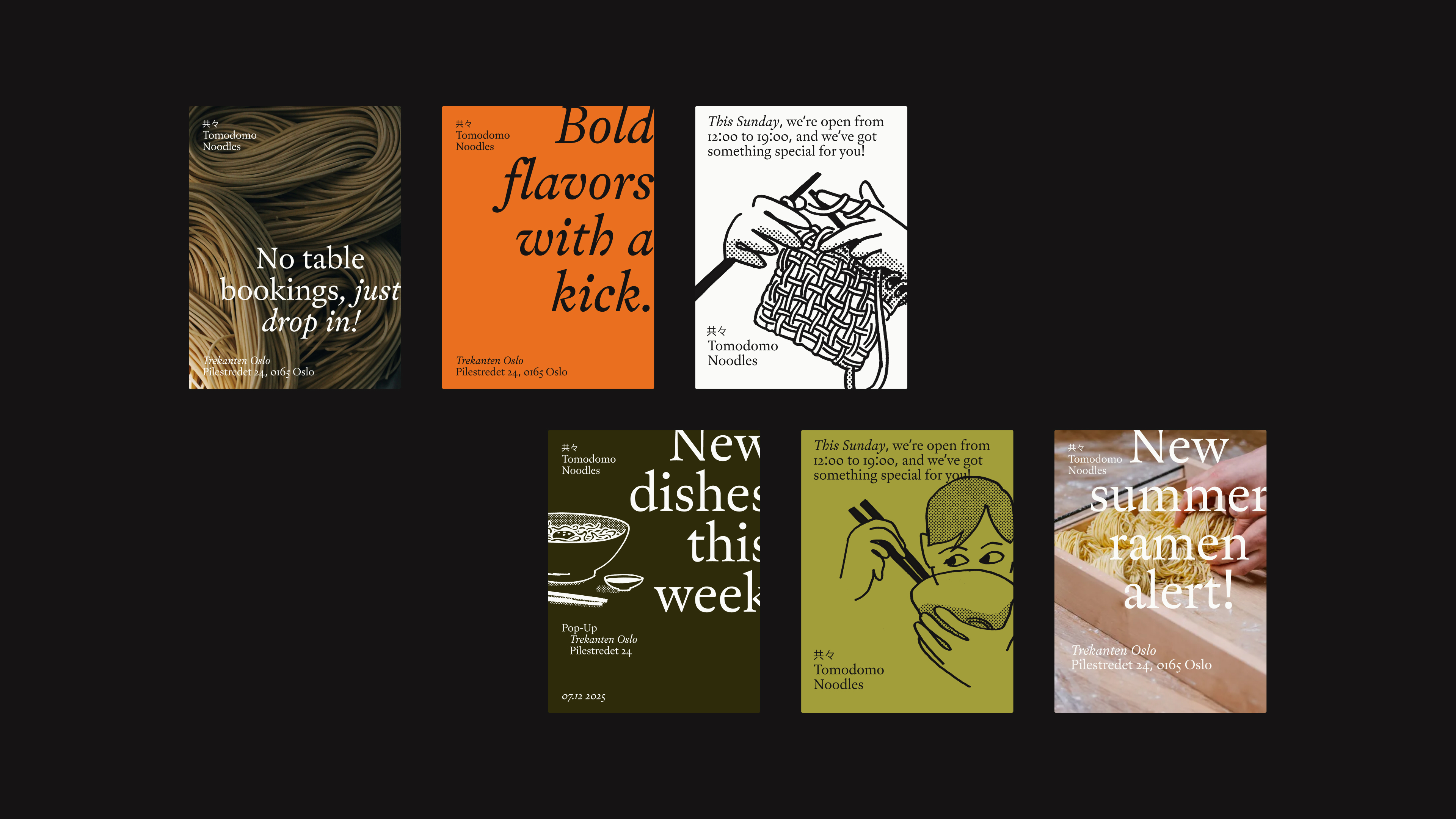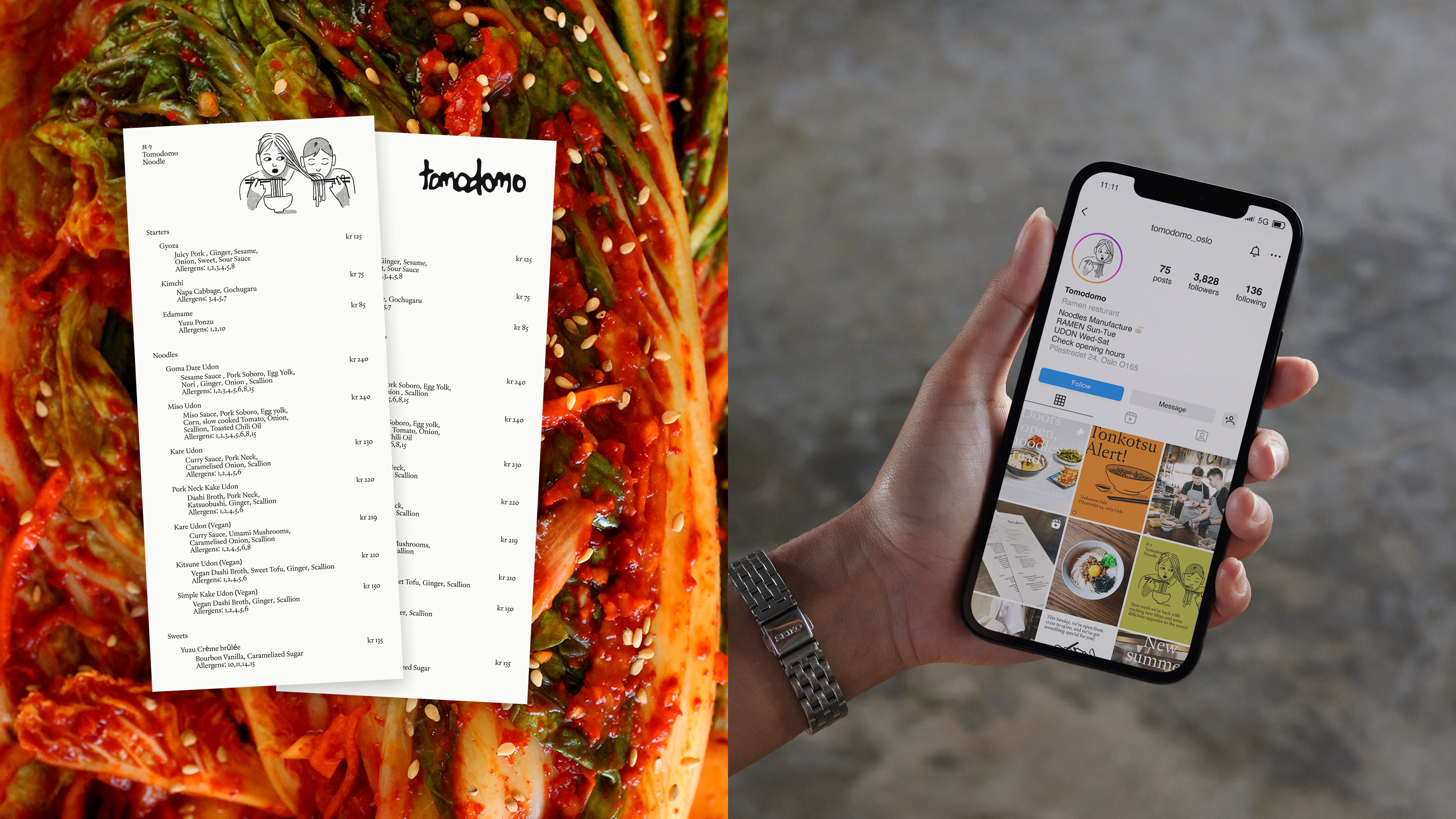 To stand out in Oslo’s competitive restaurant market, the goal was to attract an audience that values authenticity over convenience through a personality that feels sophisticated yet charmingly and accessible. Because Tomodomo operates across shifting contexts, whether it be a permanent kitchen or temporary pop-up, it required the identity to be flexible across formats.