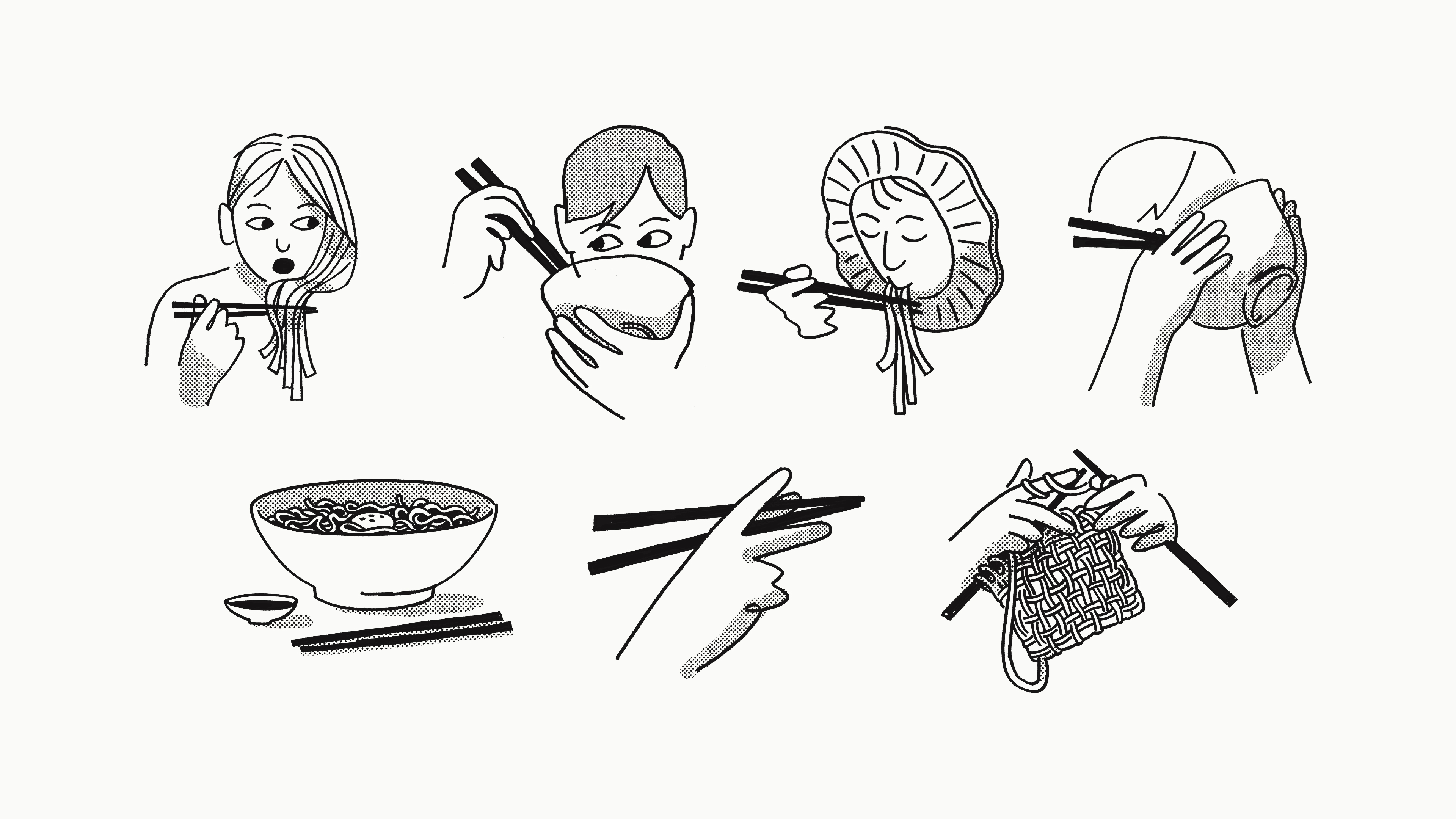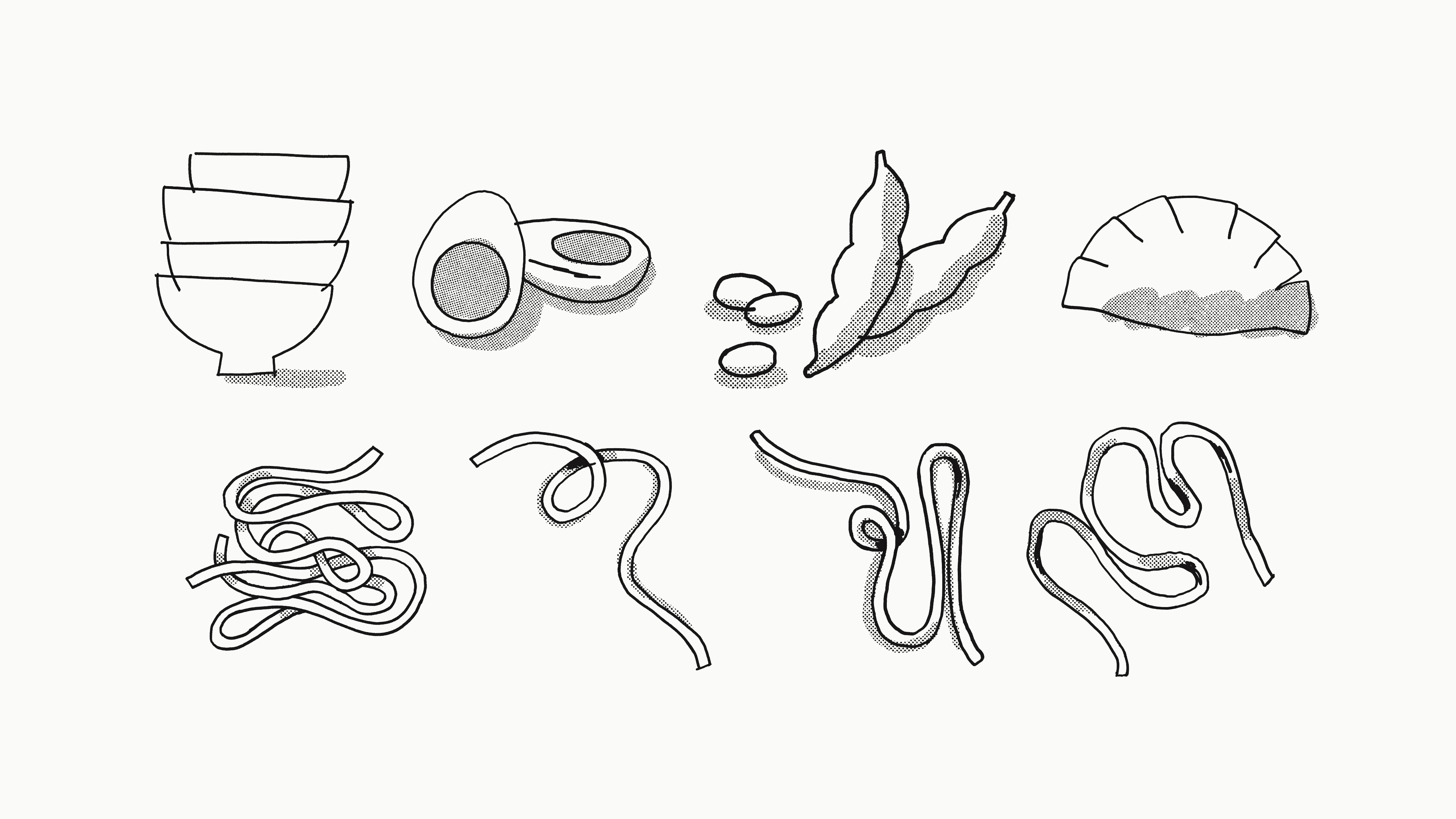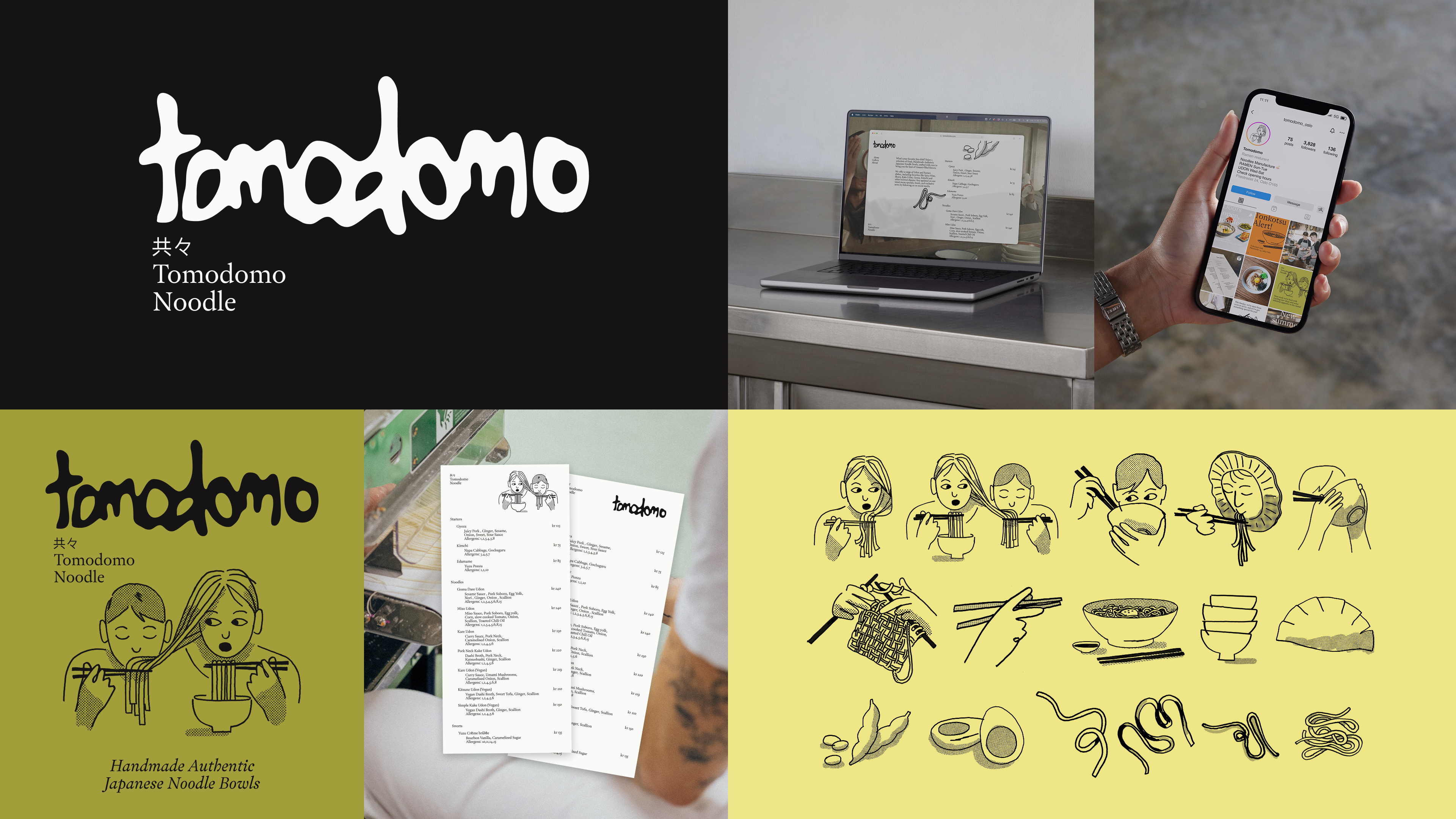 By putting weight on creating a set of bespoke illustrations to convey the human touch and artisanal craft at the core of the brand, it does not just become a visual expression. The illustration style is inspired by the tactile, irregular quality of newsprint, echoing the informal ambience of streetfood. Each hand-drawn line emphasises the raw integrity and passion the chefs pour into every bowl of ramen, soba or udon. The identity’s strength lies in the combination between elements. An organic logo resembling a broth stain, pairs with a classic typographic hierarchy for structure. Earthy colours inspired by East Asian ingredients highlight the food’s sensory appeal, whilst the bespoke illustrations lead a cohesive visual language where every distinct, edgy element harmonises.