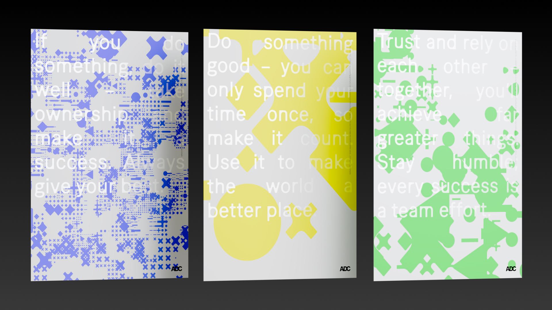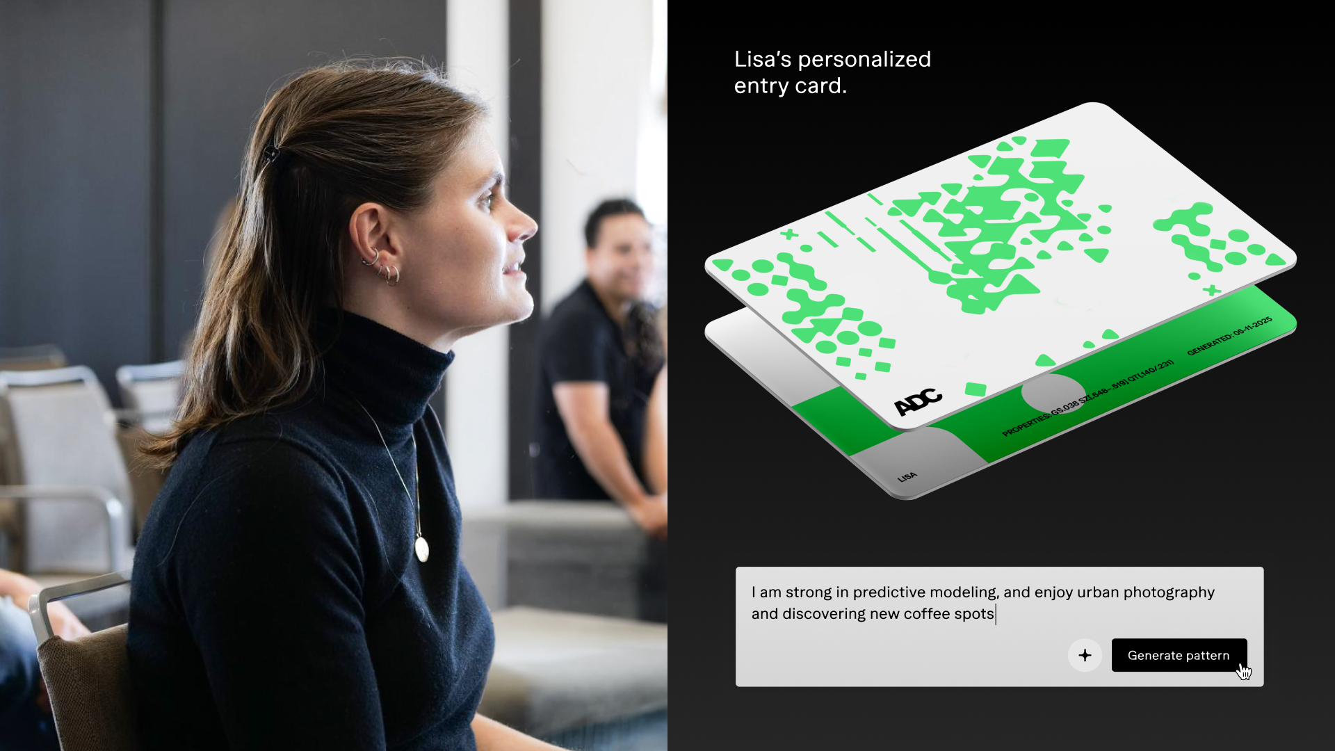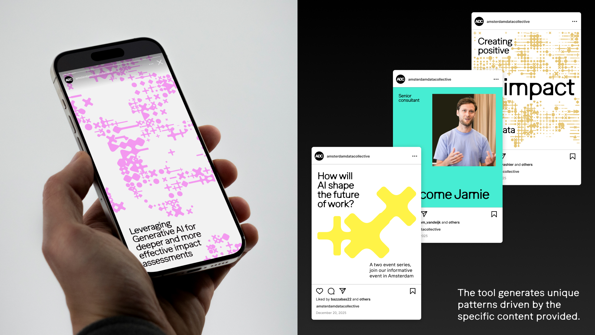 This identity redefines what a brand system can be in the age of AI. It is not authored by designers alone, but shaped through ongoing input from the ADC team, learning from individual choices while building a shared visual language. The result is a living identity that evolves over time, balancing analytical intelligence with emotion and intuition. It demonstrates how AI can be used not to standardize creativity, but to amplify it: creating a brand that grows alongside the organization and the people behind it.