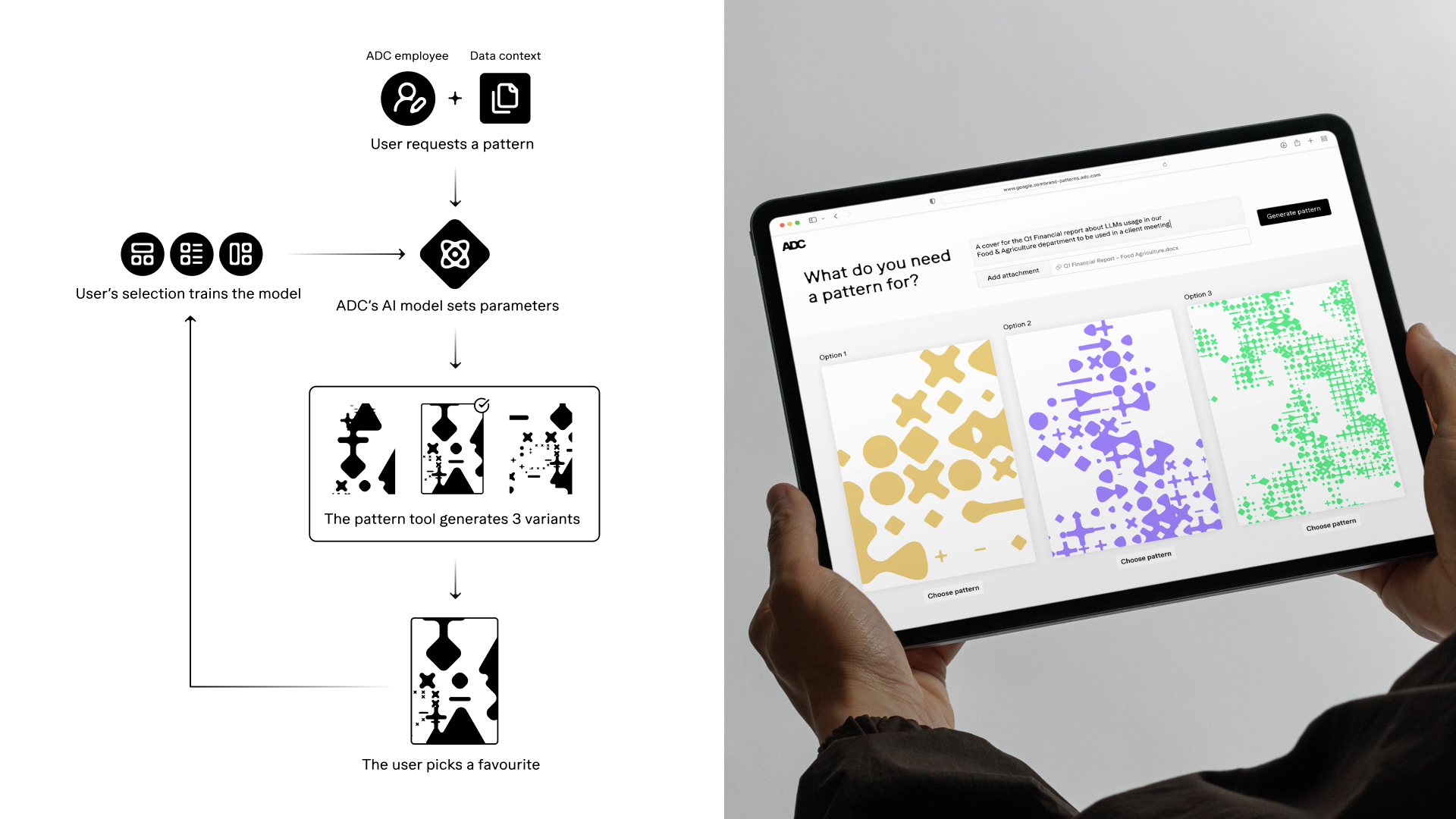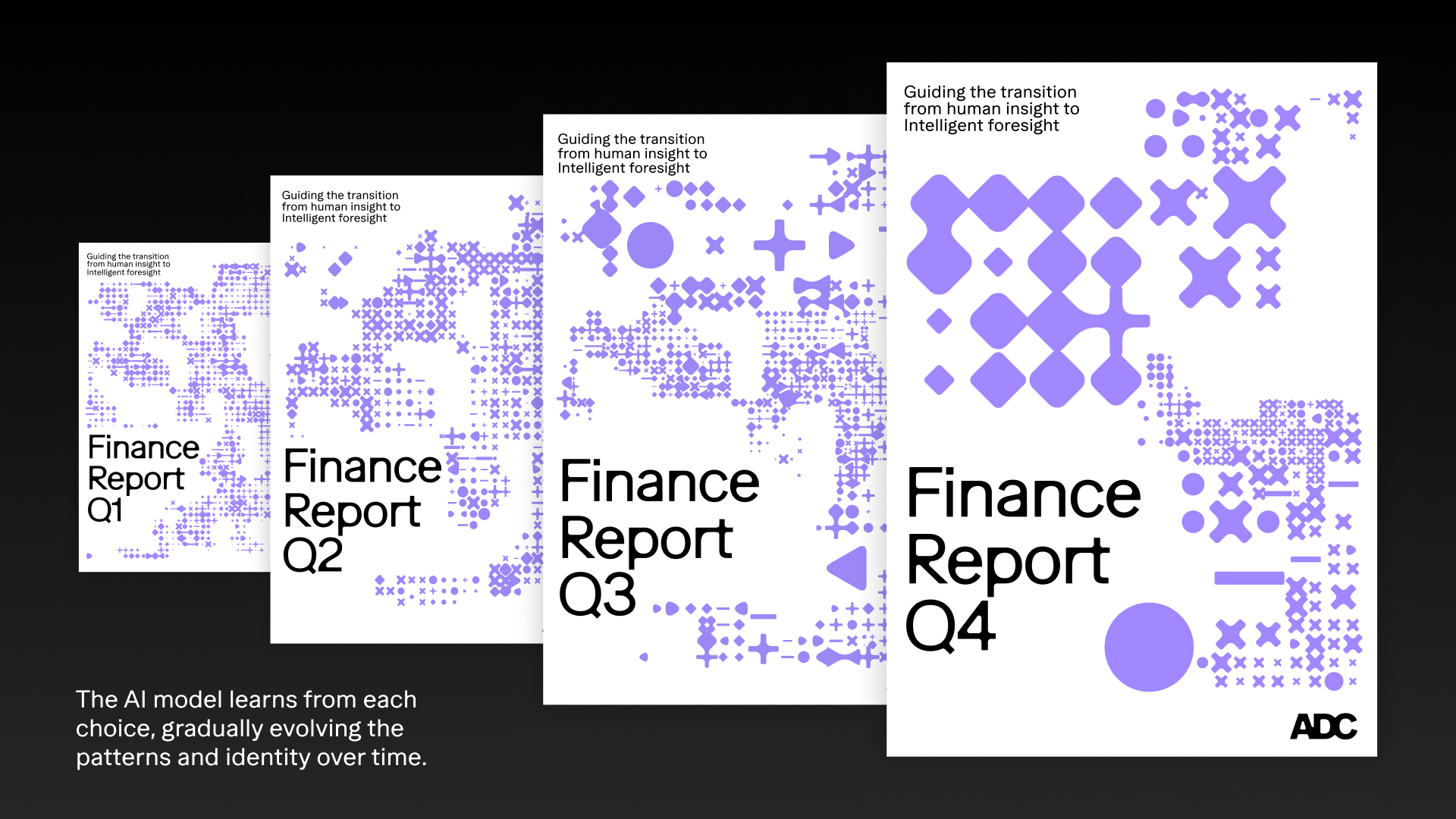 At the core of the system is collective intelligence. A custom AI model was trained to understand ADC from the inside out — its people, culture, values, work, and domains of expertise. The model learns not only how the identity looks, but how patterns are generated, how transformations occur, and how different contexts require different expressions. Through hundreds of use cases, from report covers to narrative storytelling, the system continuously refines its visual decisions.