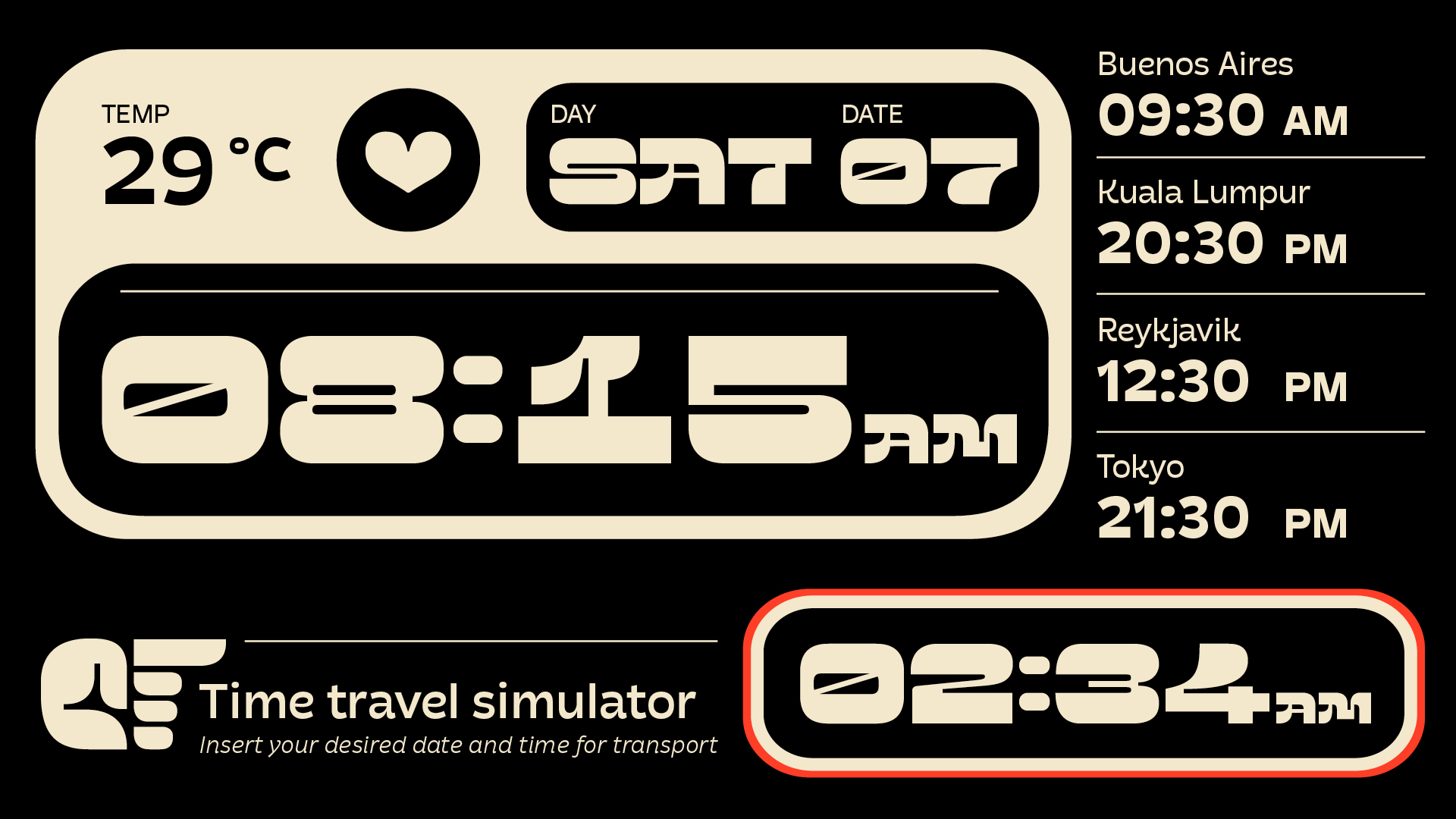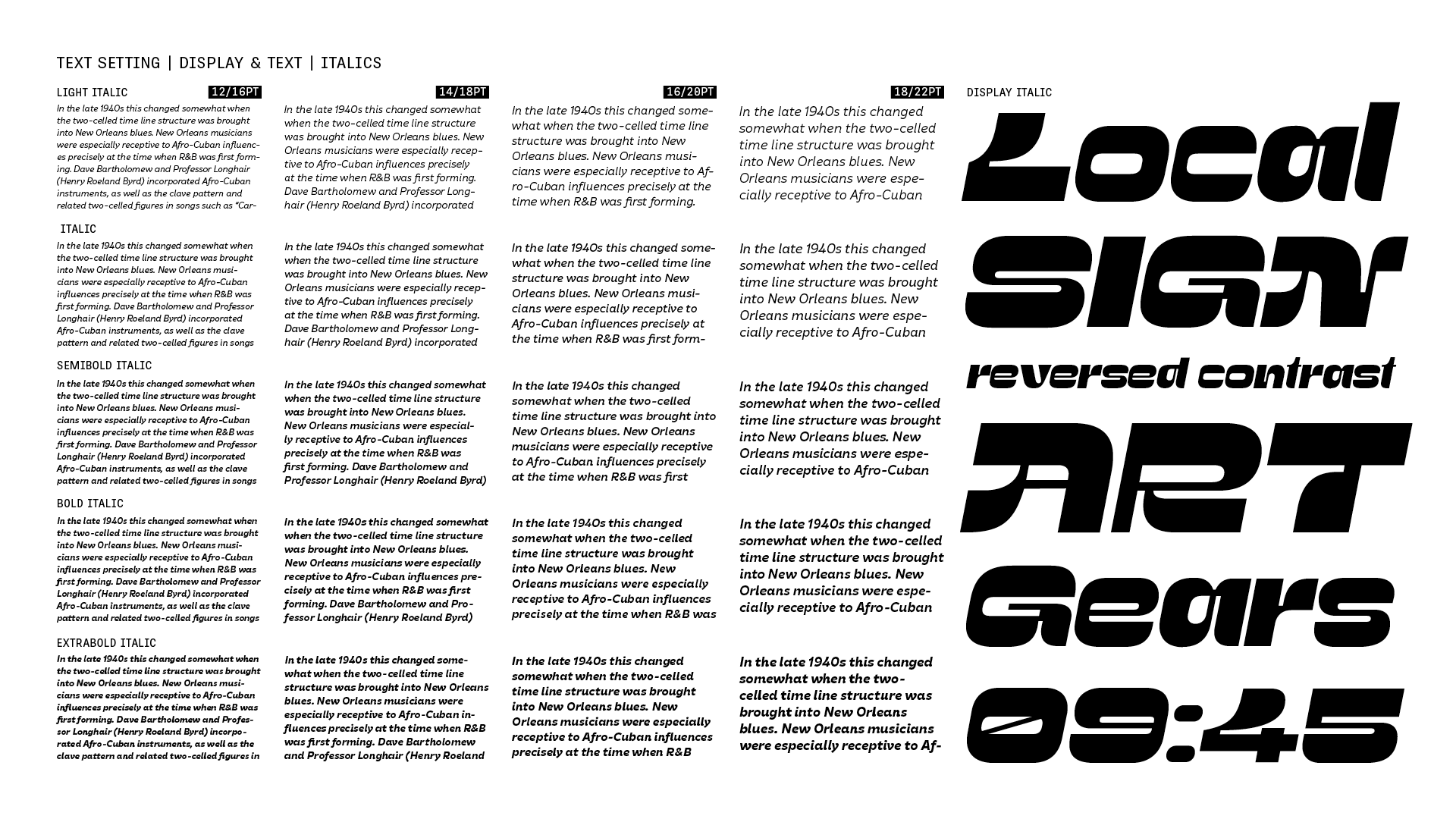 Poltik hearkens back to the time of the Polish People’s Republic with its strong influence of socialist realism in architecture. Poltik’s direct inspiration was a 1970s Polish clock design she found in her grandfather’s drawer. From only the ten numerals of the clock face, she created the bold, funky display cut of the family, and then designed complementary styles appropriate for text.