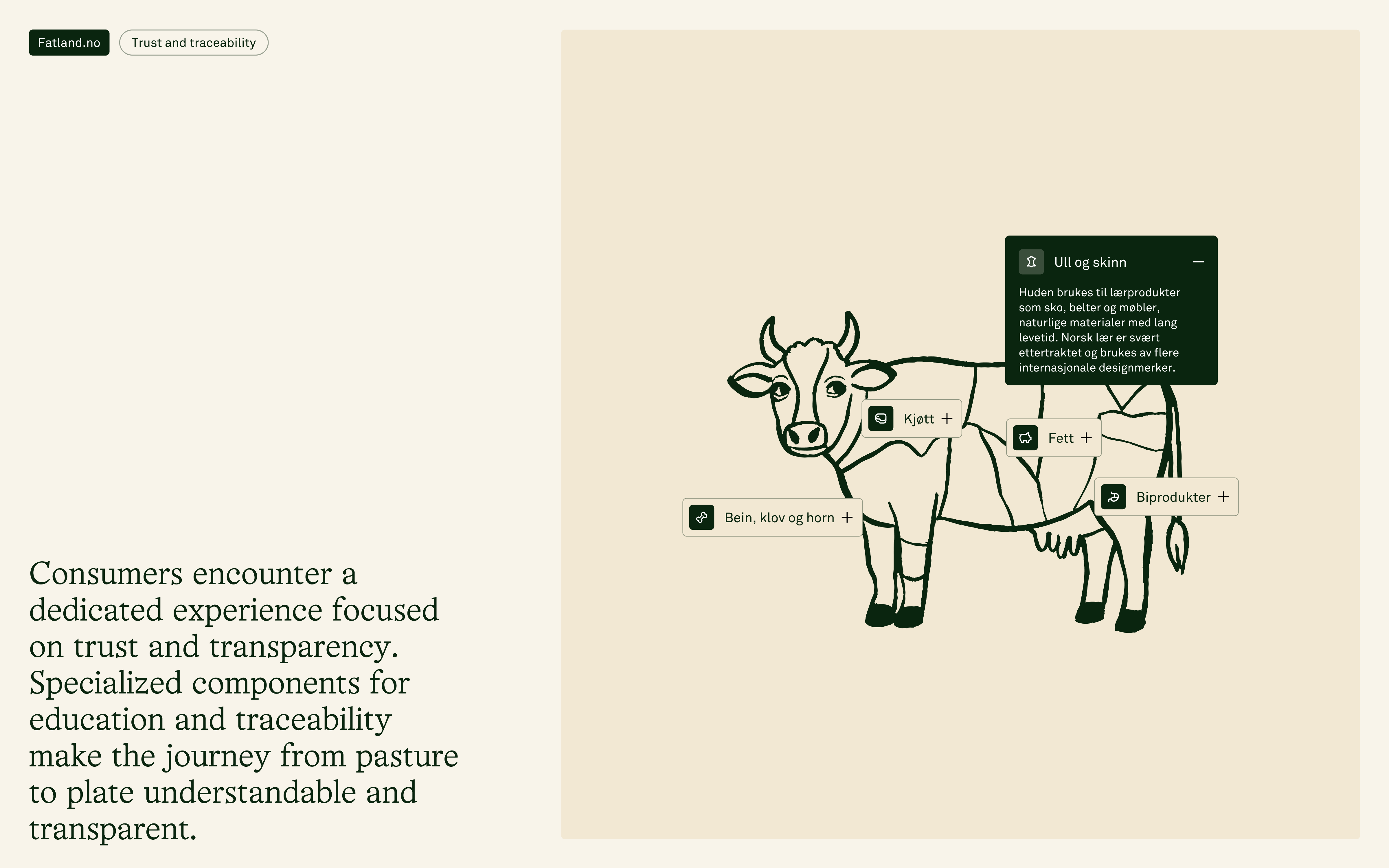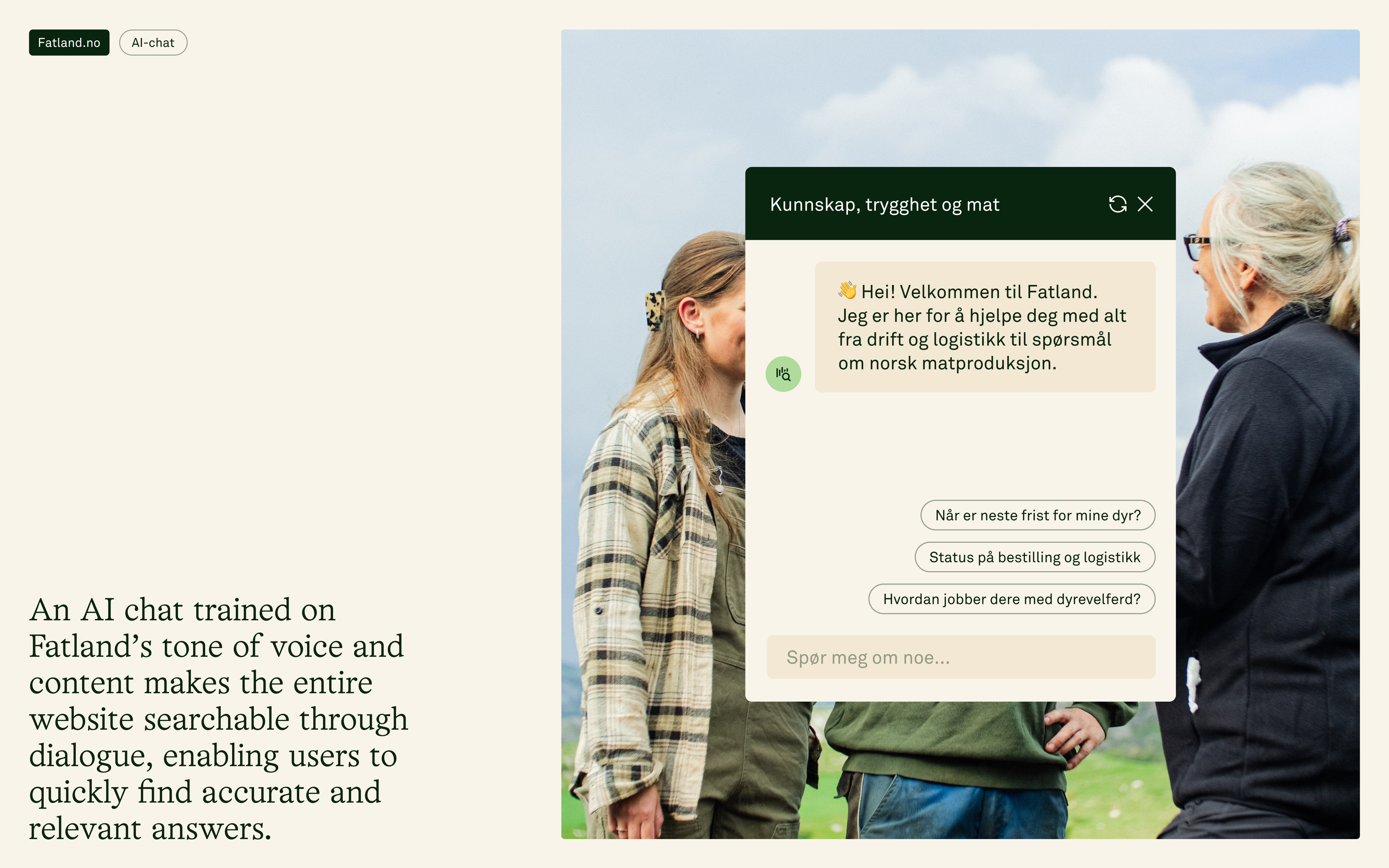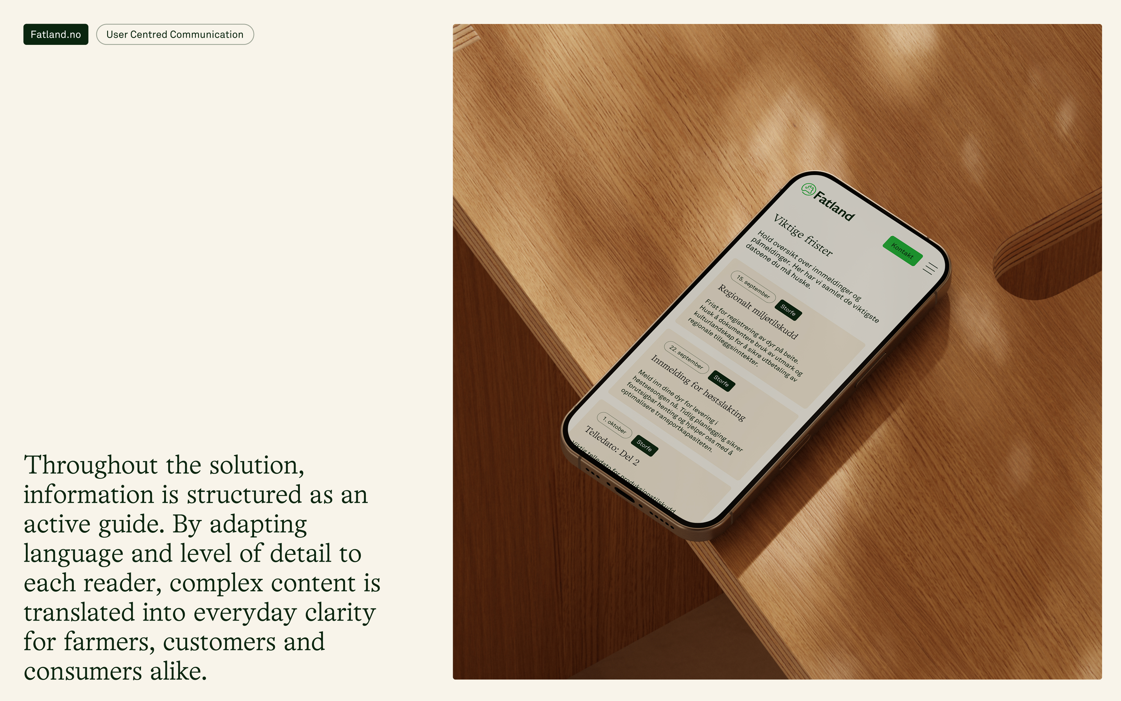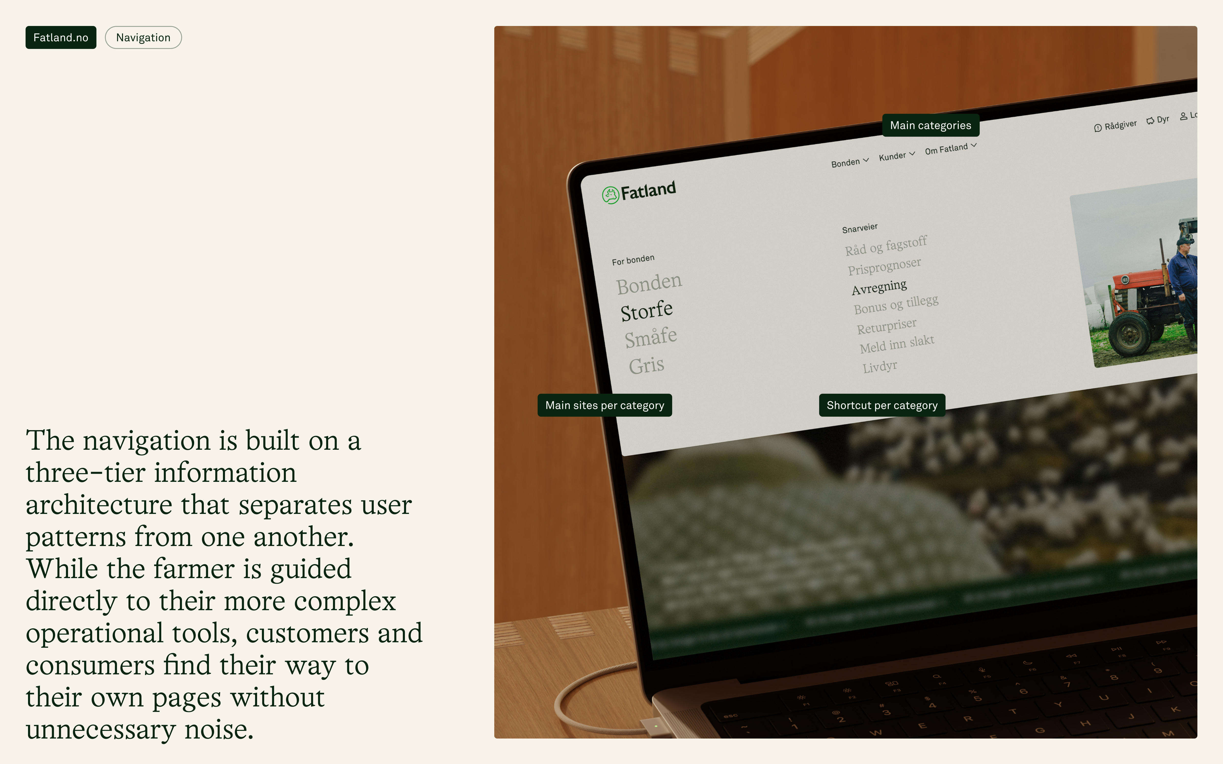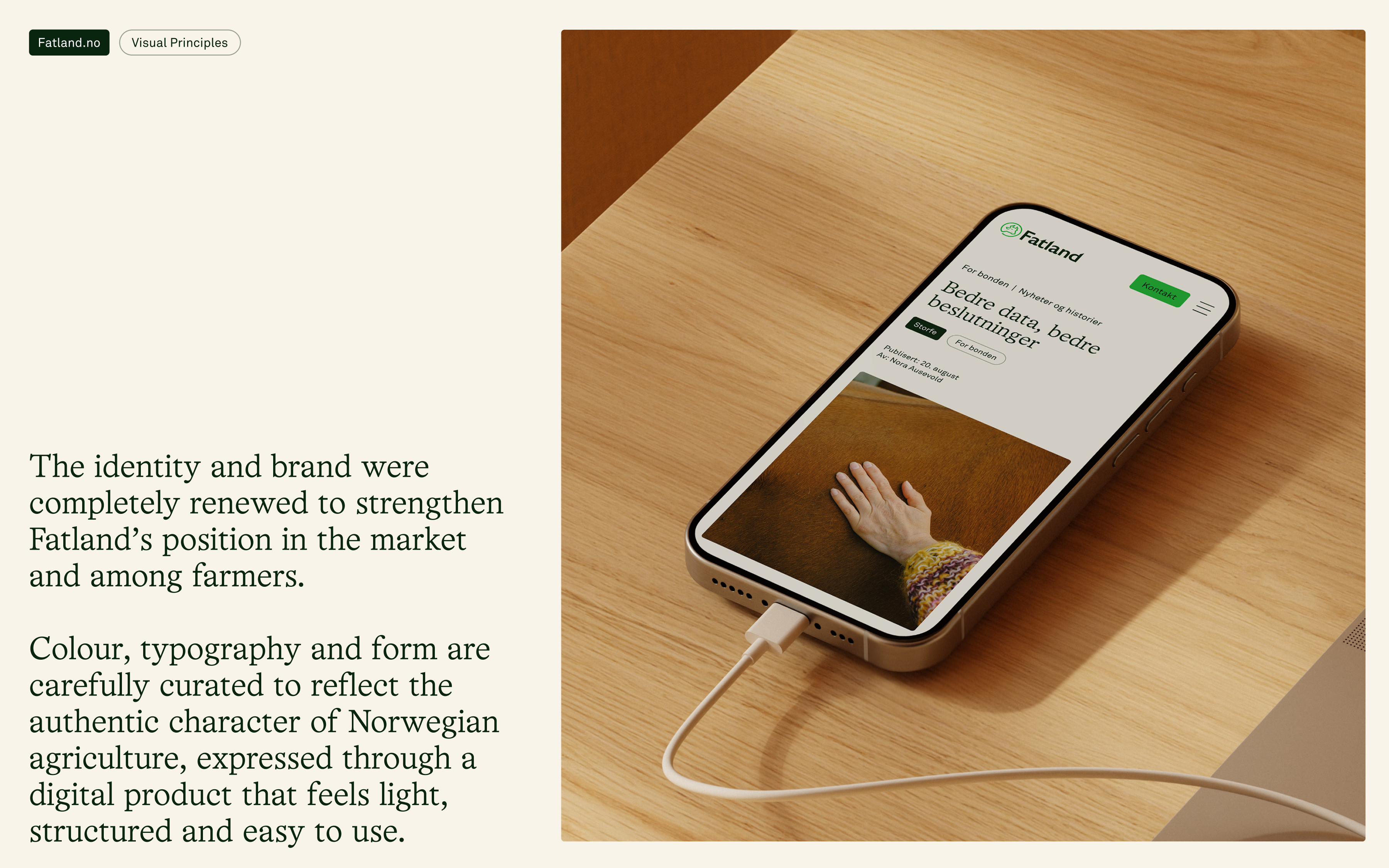 The visual identity was reimagined to give Fatland a distinct voice rooted in Norwegian farming. A carefully developed photo library grounds the brand in real people and real work. Warm tones and typography create approachability, while a disciplined layout ensures clarity and ease of navigation. The platform looks as clear as it feels to use.