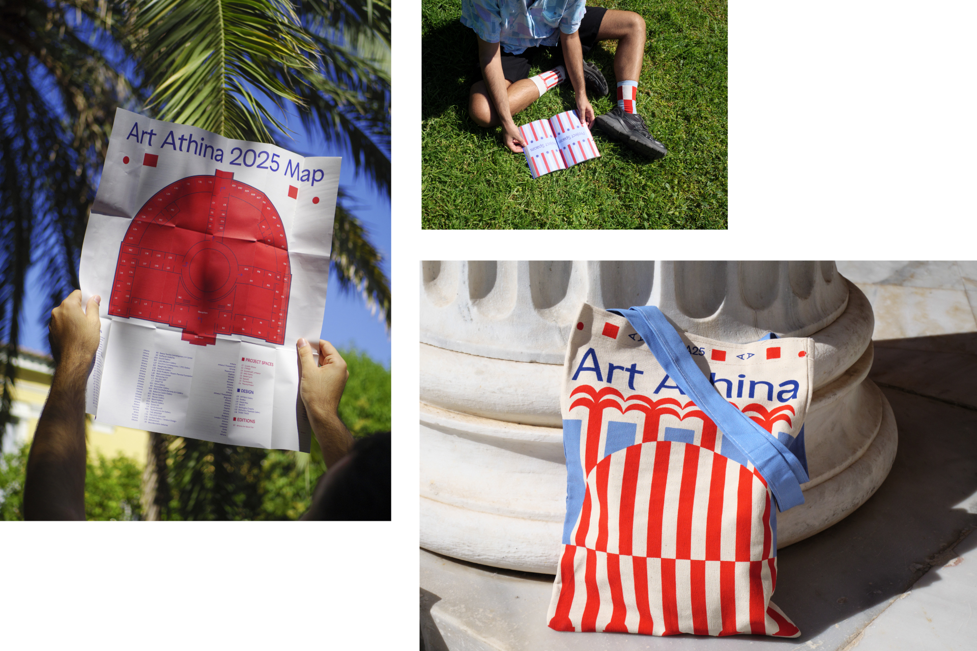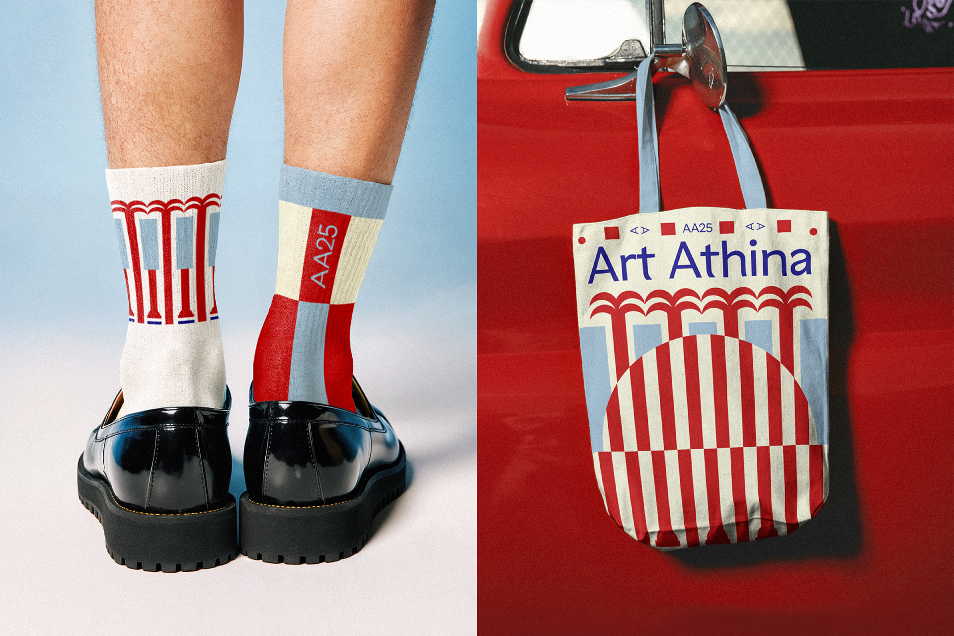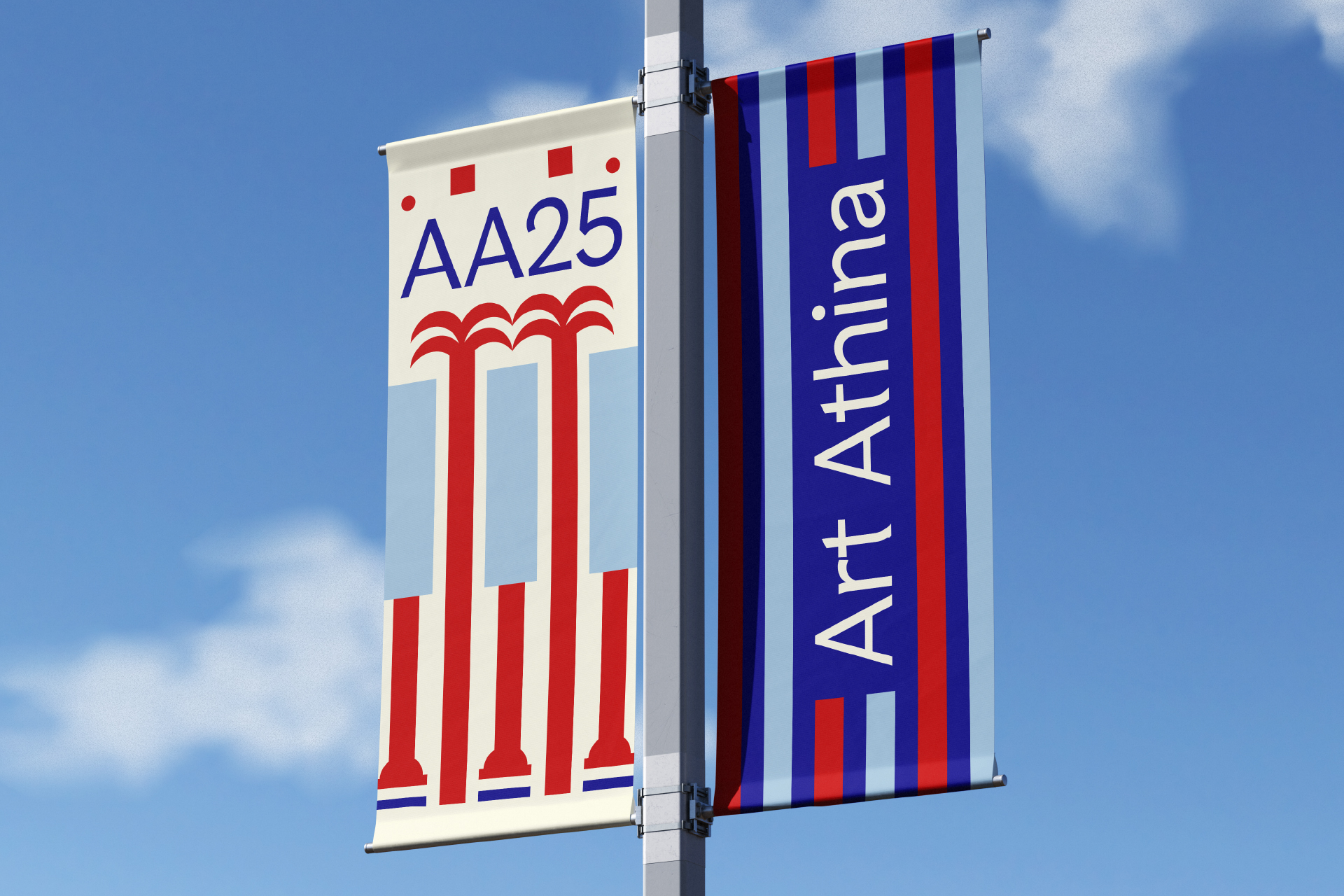 The Pool Club identity for Art Athina 2025 takes its cues from the light and geometry of Athens. Stripes of fabric, bold blocks of red and blue, and the rhythm of classical colonnades become a vocabulary of shapes — playful, fresh, and direct.