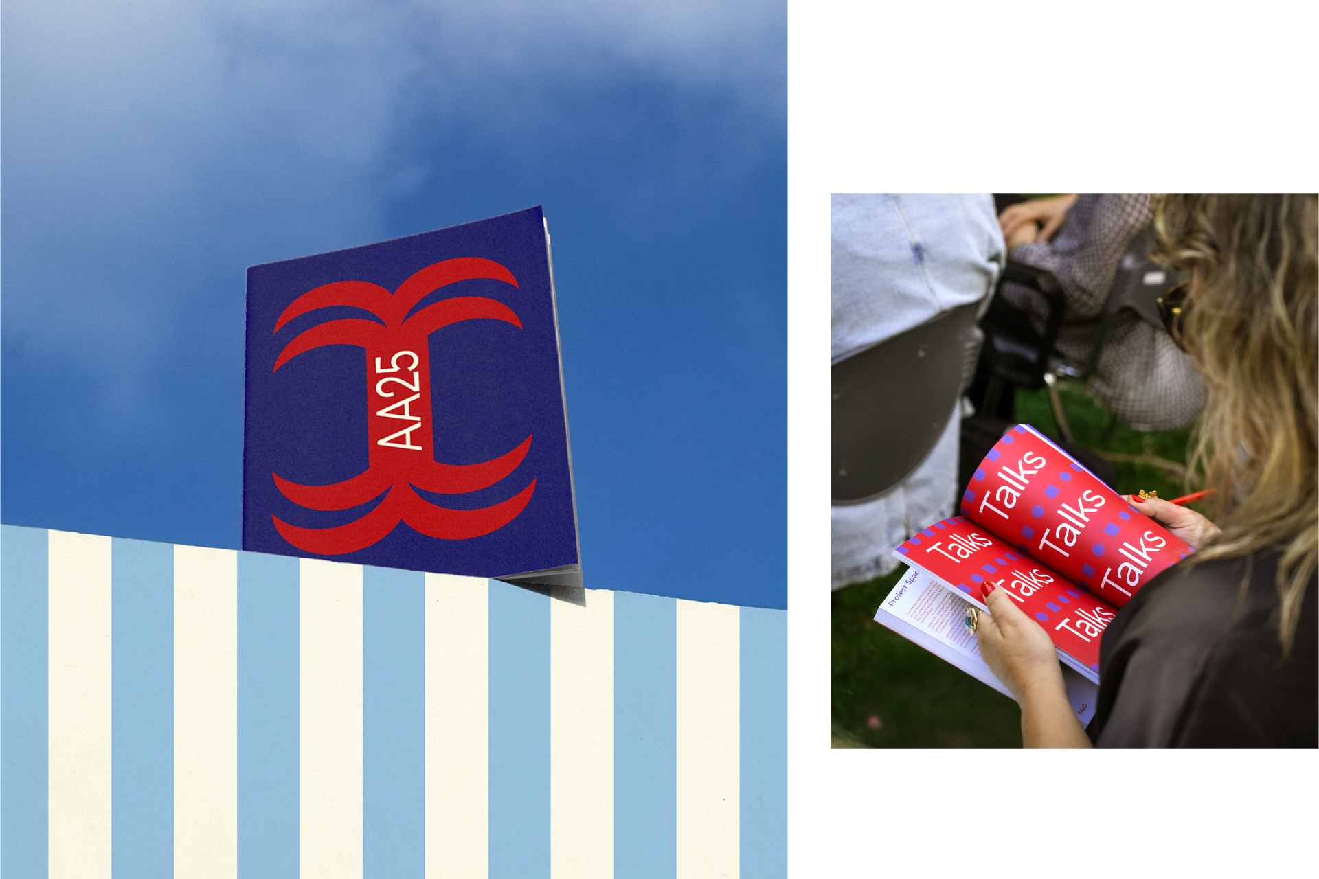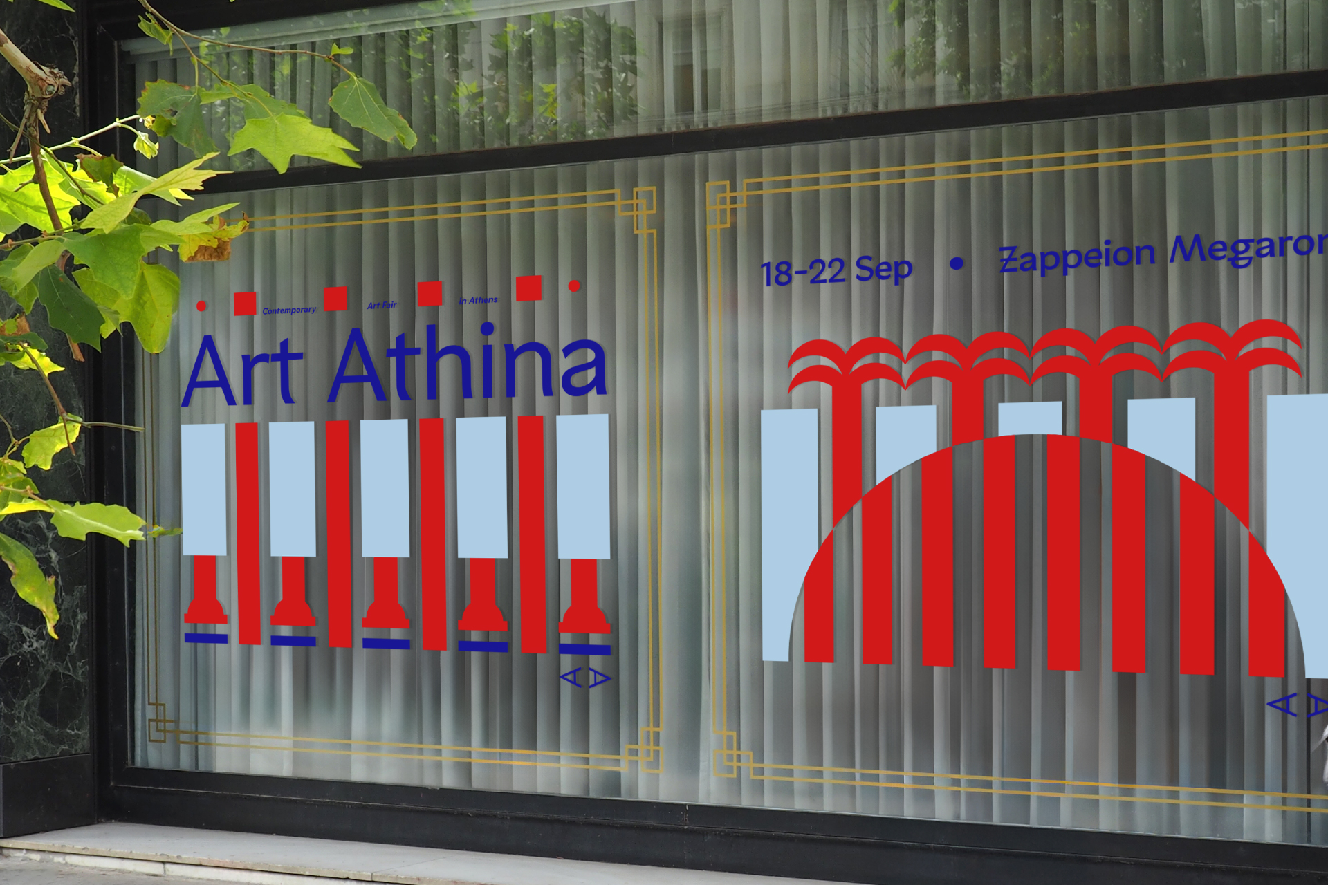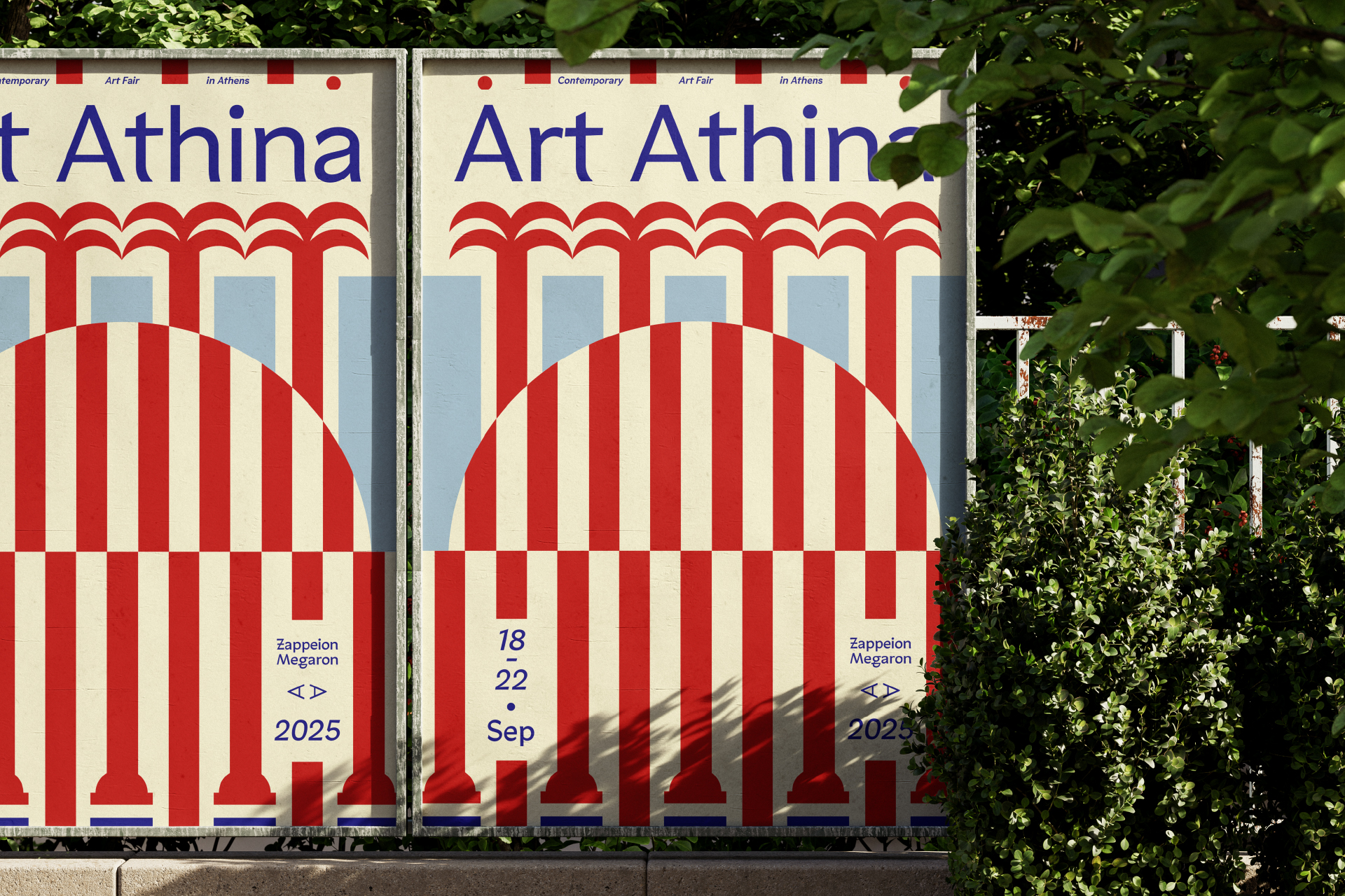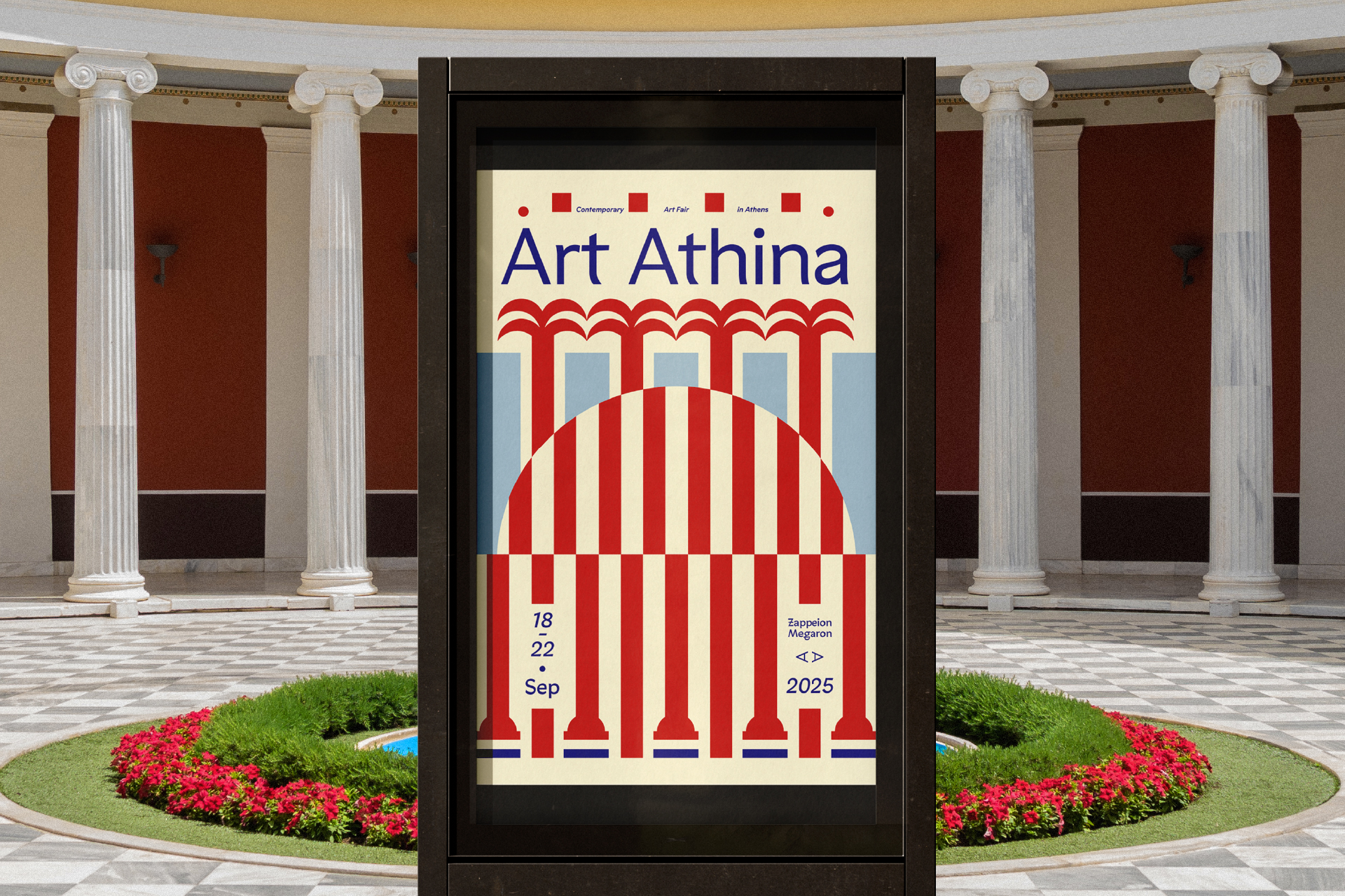 The Pool Club identity for Art Athina 2025 takes its cues from the light and geometry of Athens. Stripes of fabric, bold blocks of red and blue, and the rhythm of classical colonnades become a vocabulary of shapes — playful, fresh, and direct.